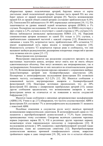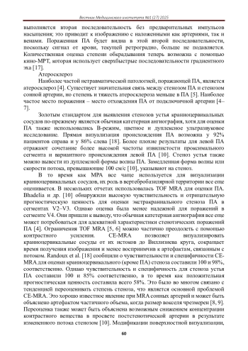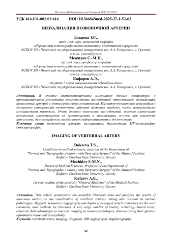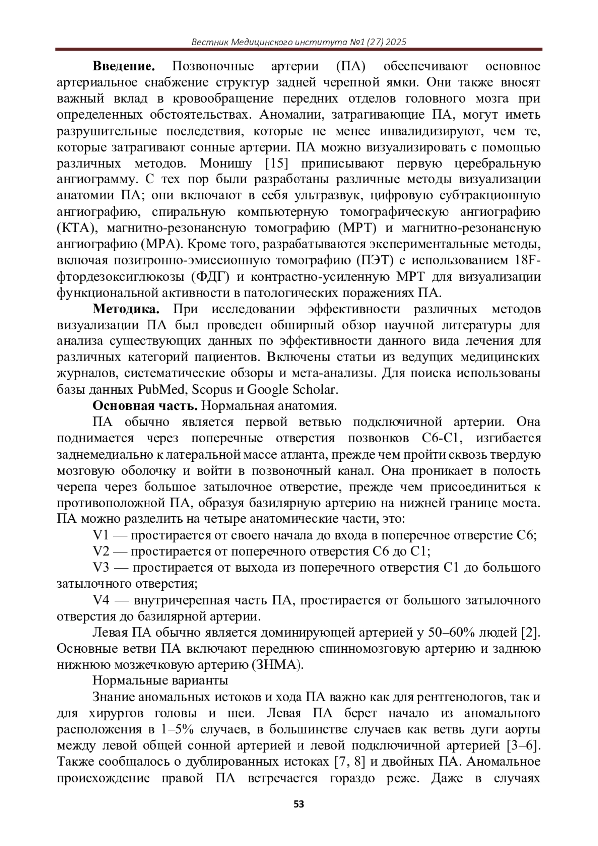 Позвоночные артерии (ПА) обеспечивают основное артериальное снабжение структур задней черепной ямки. Они также вносят важный вклад в кровообращение передних отделов головного мозга при определенных обстоятельствах. Аномалии, затрагивающие ПА, могут иметь разрушительные последствия, которые не менее инвалидизируют, чем те, которые затрагивают сонные артерии. ПА можно визуализировать с помощью различных методов. Монишу [15] приписывают первую церебральную ангиограмму. С тех пор были разработаны различные методы визуализации анатомии ПА; они включают в себя ультразвук, цифровую субтракционную ангиографию, спиральную компьютерную томографическую ангиографию (КТА), магнитно-резонансную томографию (МРТ) и магнитно-резонансную ангиографию (МРА). Кроме того, разрабатываются экспериментальные методы, включая позитронно-эмиссионную томографию (ПЭТ) с использованием 18Fфтордезоксиглюкозы (ФДГ) и контрастно-усиленную МРТ для визуализации функциональной активности в патологических поражениях ПА.