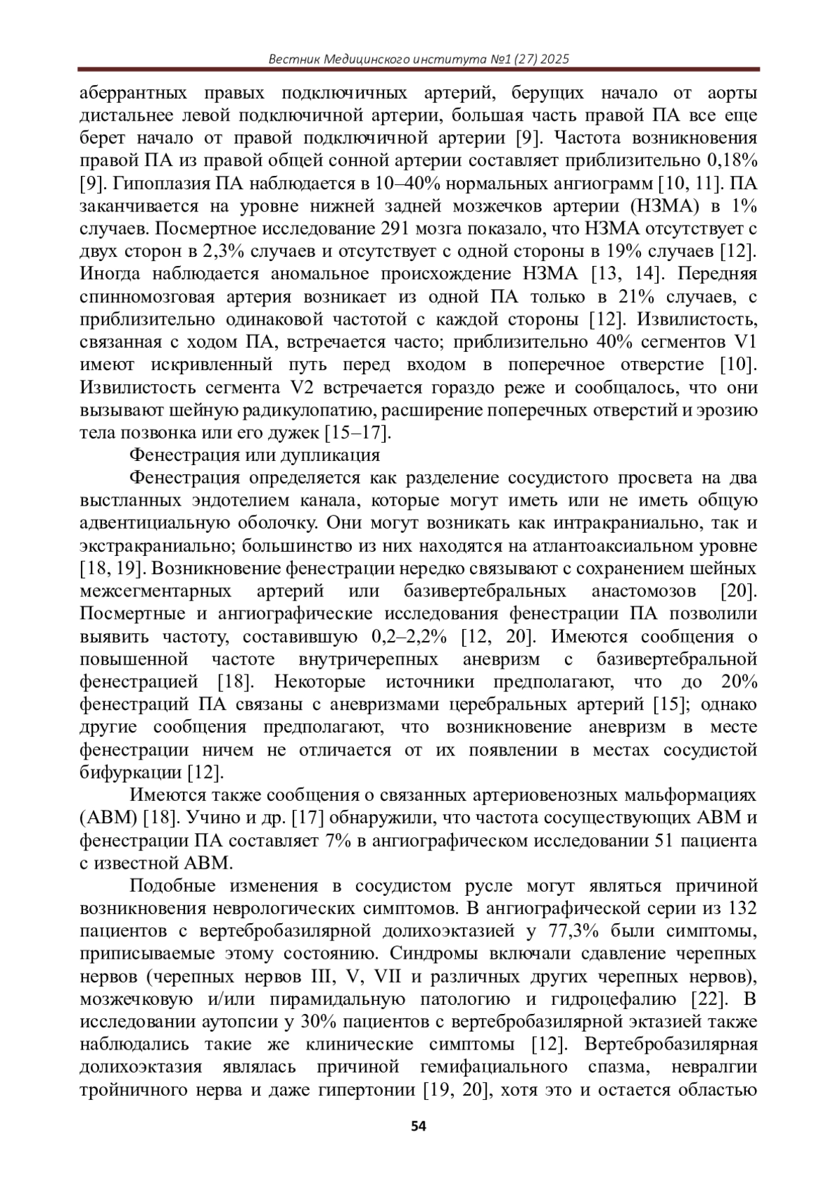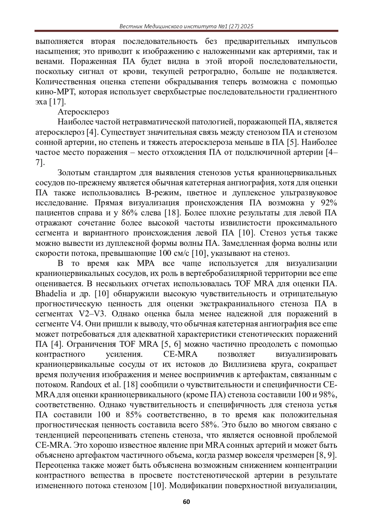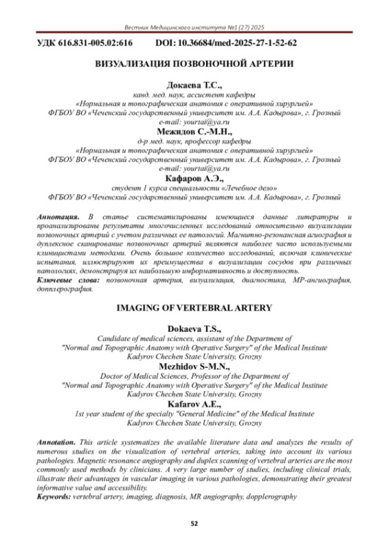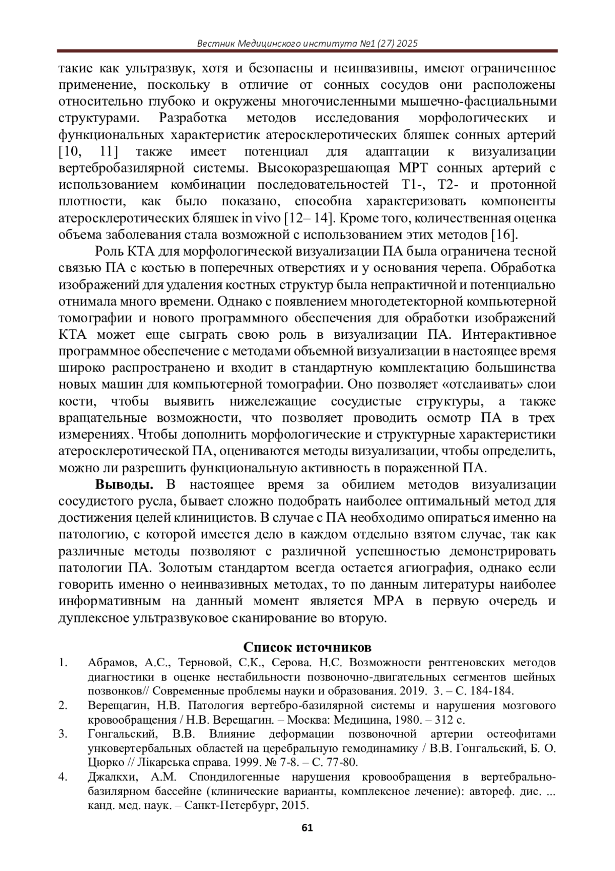В статье систематизированы имеющиеся данные литературы и проанализированы результаты многочисленных исследований относительно визуализации позвоночных артерий с учетом различных ее патологий. Магнитно-резонансная агиография и дуплексное сканирование позвоночных артерий являются наиболее часто используемыми клиницистами методами. Очень большое количество исследований, включая клинические испытания, иллюстрируют их преимущества в визуализации сосудов при различных патологиях, демонстрируя их наибольшую информативность и доступность.