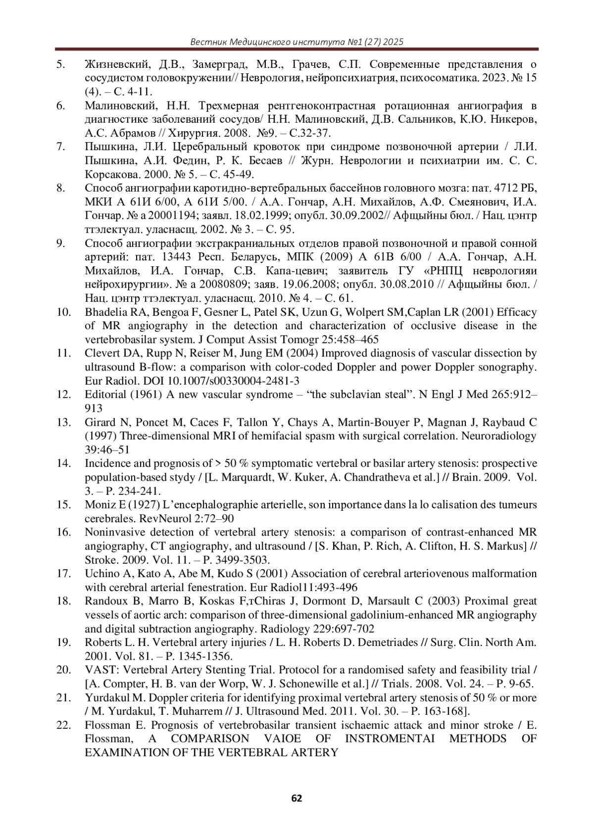 3. Гонгальский, В.В. Влияние деформации позвоночной артерии остеофитами унковертербальных областей на церебральную гемодинамику / В.В. Гонгальский, Б. О. Цюрко // Лiкарська справа. 1999. № 7-8. - С. 77-80.