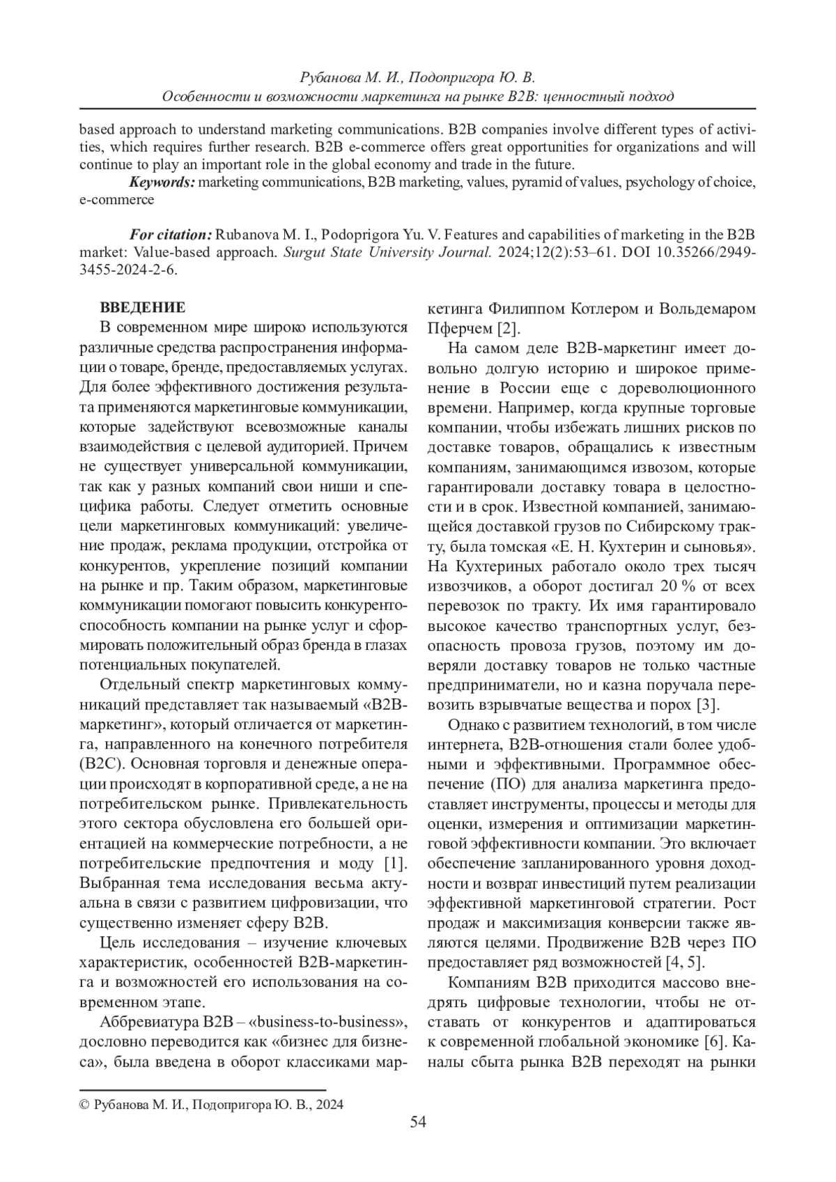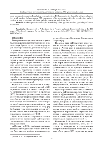Цифровое ускорение, вызванное пандемией, усилило интерес компаний к В2В во всем мире. Цель исследования – изучение ключевых характеристик, особенностей B2B-маркетинга и возможностей его использования на современном этапе. В статье изучены научные труды маркетологов; рассмотрены элементы пирамиды ценностей B2B; рассмотрен маркетинговый подход по удовлетворению потребностей клиентов; изучены В2В-технологии для разработки новых маркетинговых стратегий и методов продажи товаров и услуг. Новизна исследования заключается в расширении представления об эффективных маркетинговых взаимодействиях в сфере B2B с точки зрения ценностного подхода. Проведенное исследование подтверждает, что использование компаниями определенных маркетинговых качеств в B2B-сфере может положительно повлиять на решение клиентов о покупке в пользу компании. Поведение клиента не всегда рационально и требует ценностного подхода для понимания маркетинговых коммуникаций. Компании, работающие в сфере B2B, включают в себя различные виды деятельности, что требует дальнейших исследований. Электронная коммерция в B2B раскрывает большие возможности для организаций и в перспективе будет продолжать играть важную роль в мировой экономике и торговле.
