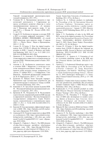 5. Скляр В. Н. Особенности продаж в секторах B2B и B2C в условиях цифровой экономики // ЭКО-НОМИКА, БИЗНЕС, ИННОВАЦИИ : сб. статей XXII Междунар. науч.-практич. конф., 15 апреля 2023 г., г. Пенза. Пенза : Наука и Просвещение, 2023. С. 22-24.
