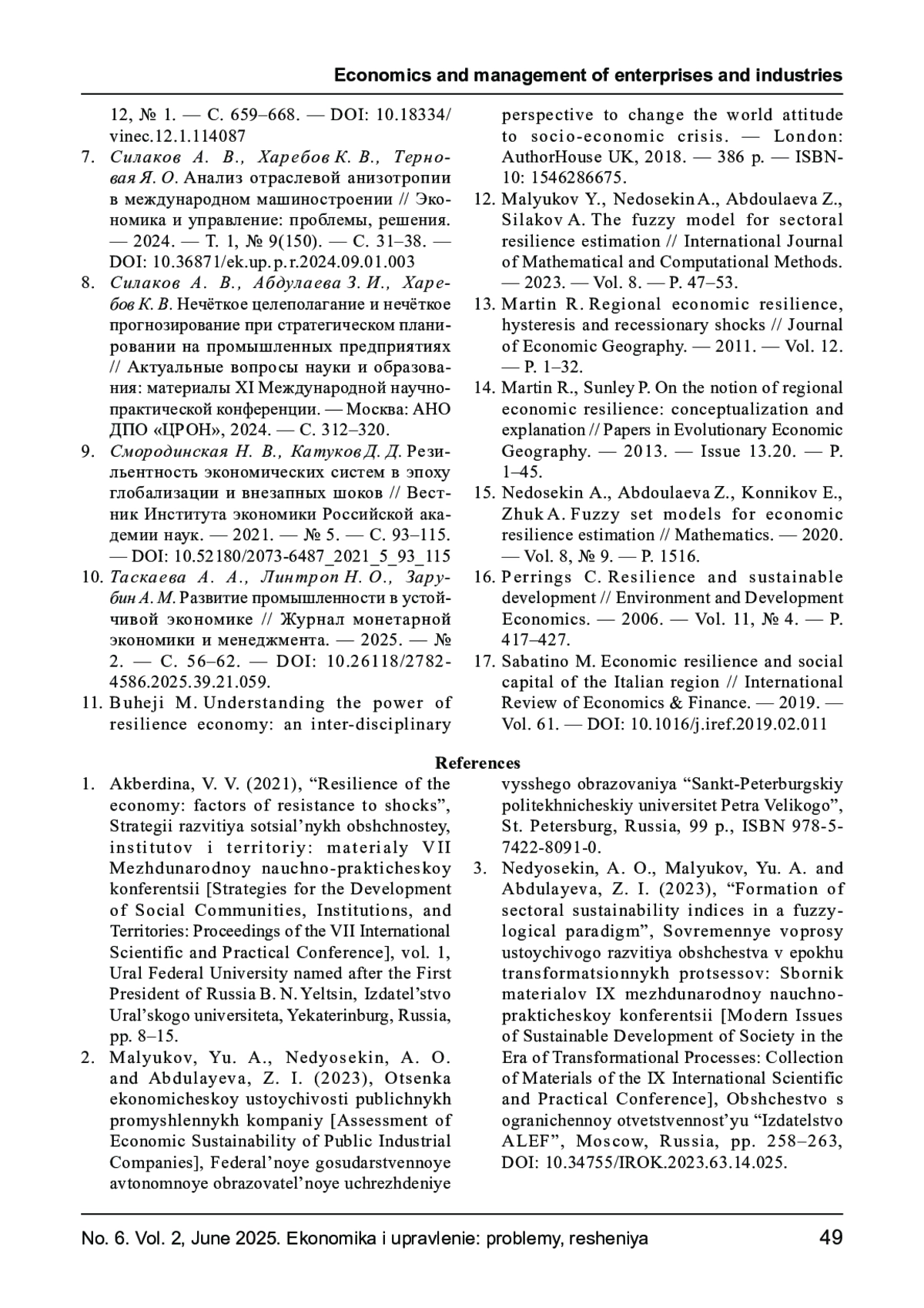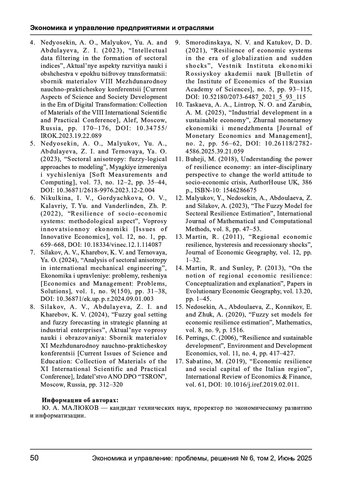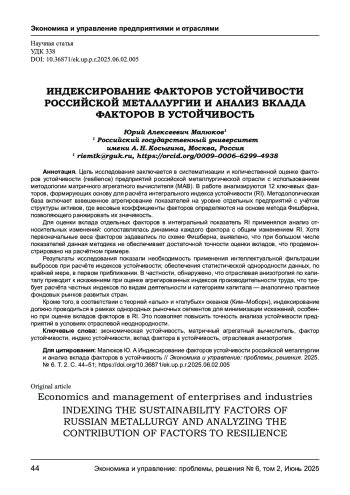МАЛЮКОВ Ю. А. ИНДЕКСИРОВАНИЕ ФАКТОРОВ УСТОЙЧИВОСТИ РОССИЙСКОЙ МЕТАЛЛУРГИИ И АНАЛИЗ ВКЛАДА ФАКТОРОВ В УСТОЙЧИВОСТЬ // ЭКОНОМИКА И УПРАВЛЕНИЕ: ПРОБЛЕМЫ, РЕШЕНИЯ. 2025. ТОМ 2 № 6