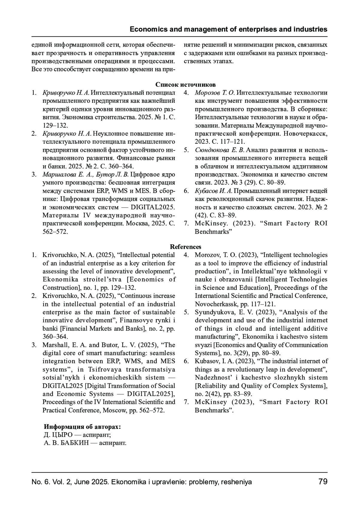 1. Криворучко Н. А. Интеллектуальный потенциал промышленного предприятия как важнейший критерий оценки уровня инновационного развития. Экономика строительства. 2025. № 1. С.129-132. EDN: ENYIPE