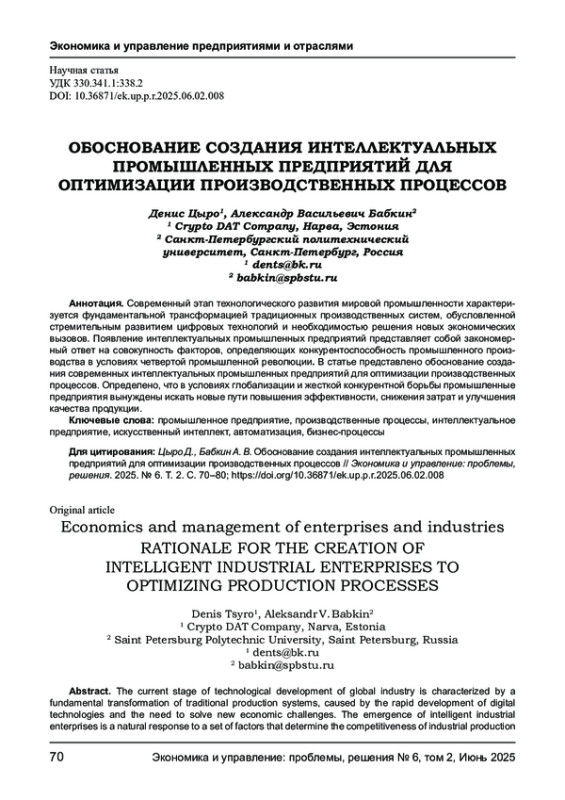 Современный этап технологического развития мировой промышленности характеризуется фундаментальной трансформацией традиционных производственных систем, обусловленной стремительным развитием цифровых технологий и необходимостью решения новых экономических вызовов. Появление интеллектуальных промышленных предприятий представляет собой закономерный ответ на совокупность факторов, определяющих конкурентоспособность промышленного производства в условиях четвертой промышленной революции. В статье представлено обоснование создания современных интеллектуальных промышленных предприятий для оптимизации производственных процессов. Определено, что в условиях глобализации и жесткой конкурентной борьбы промышленные предприятия вынуждены искать новые пути повышения эффективности, снижения затрат и улучшения качества продукции.