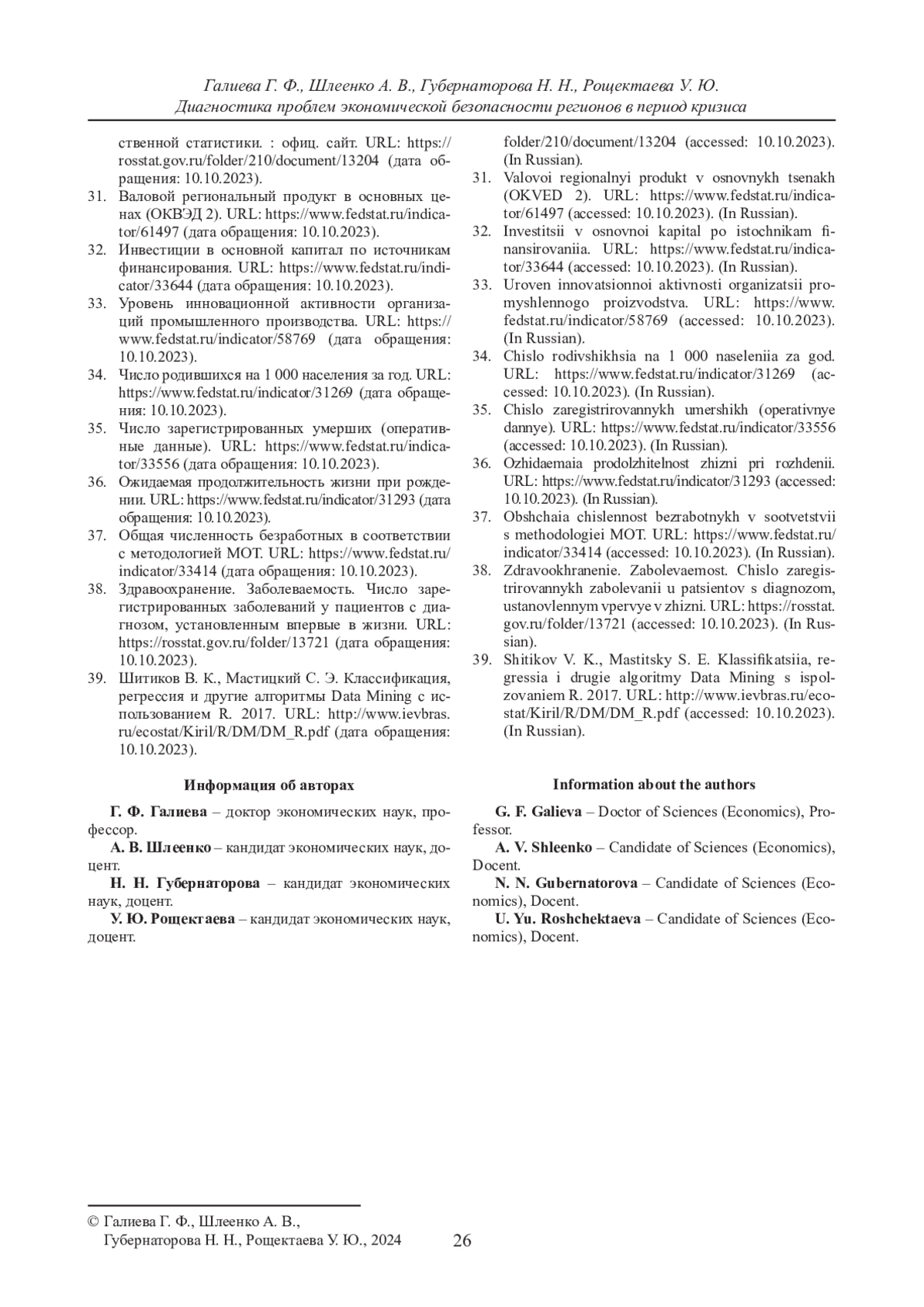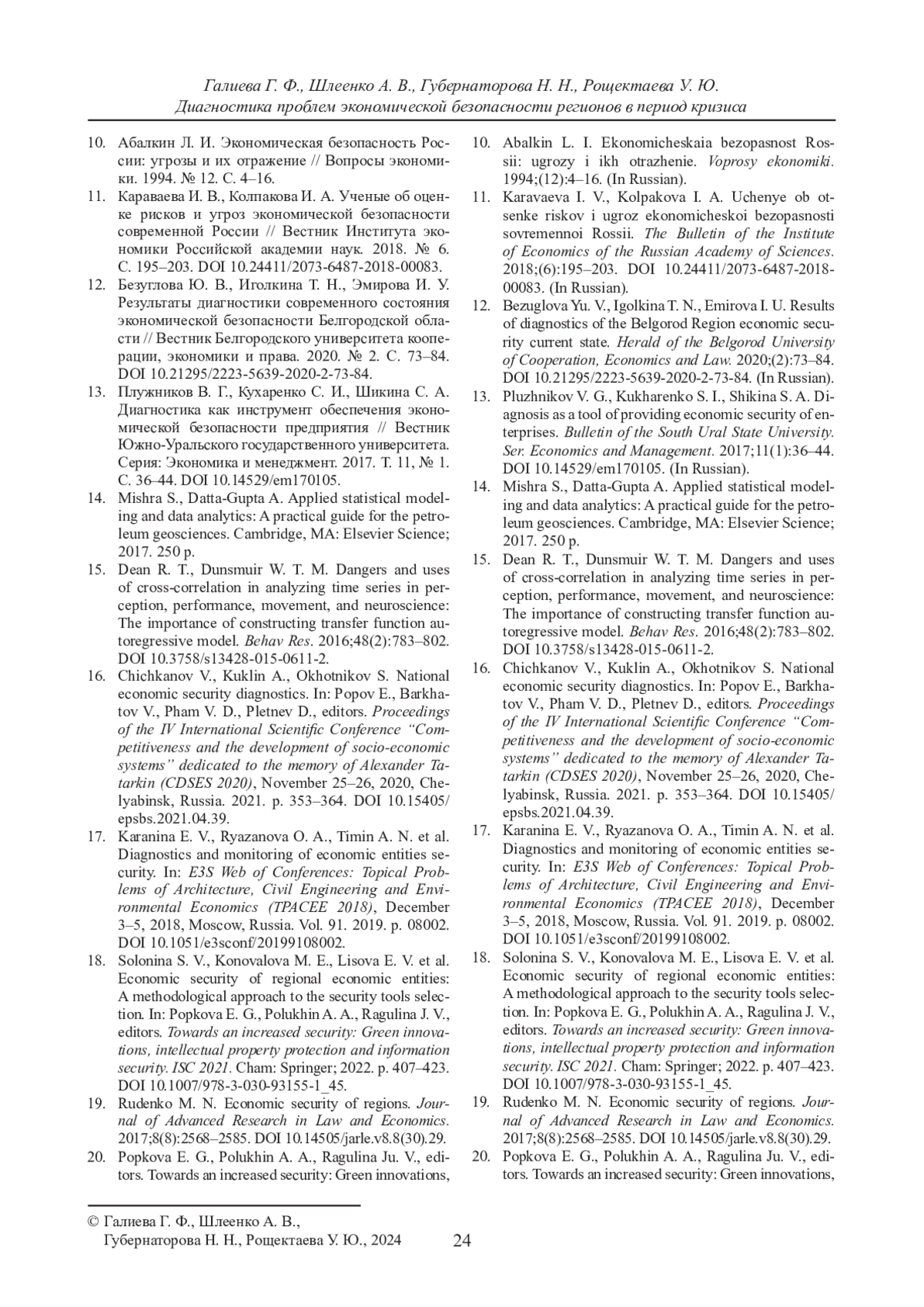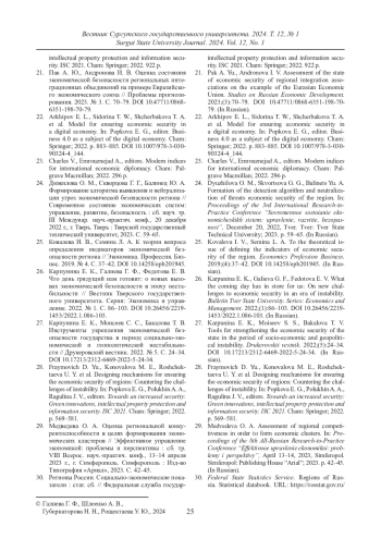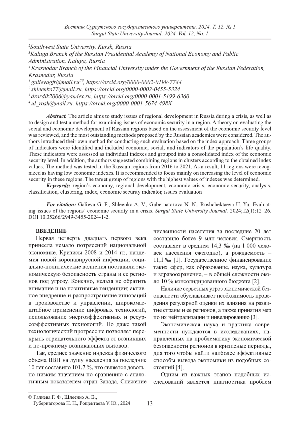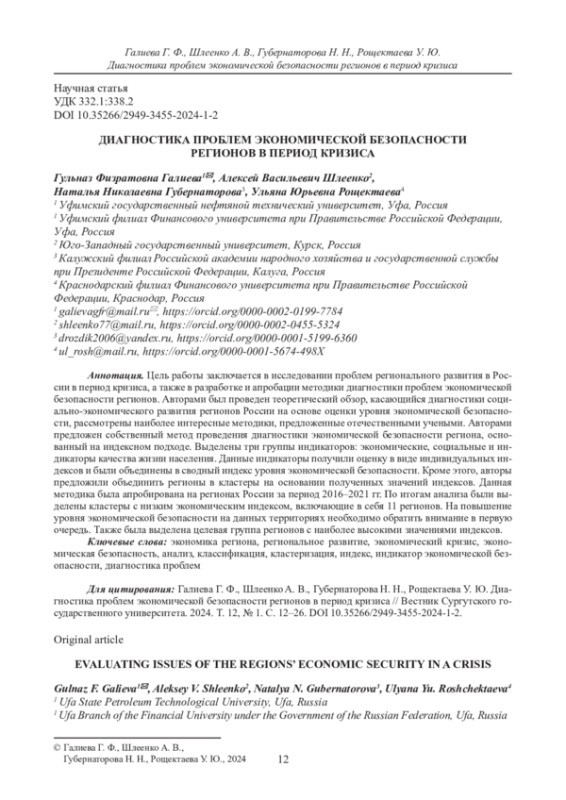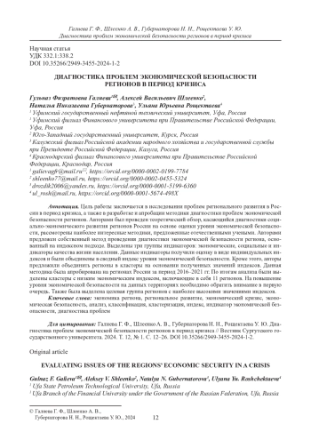 ГАЛИЕВА Г. Ф., ШЛЕЕНКО А. В., ГУБЕРНАТОРОВА Н. Н., РОЩЕКТАЕВА У. Ю. ДИАГНОСТИКА ПРОБЛЕМ ЭКОНОМИЧЕСКОЙ БЕЗОПАСНОСТИ РЕГИОНОВ В ПЕРИОД КРИЗИСА // ВЕСТНИК СУРГУТСКОГО ГОСУДАРСТВЕННОГО УНИВЕРСИТЕТА. 2024. ТОМ 12, № 1