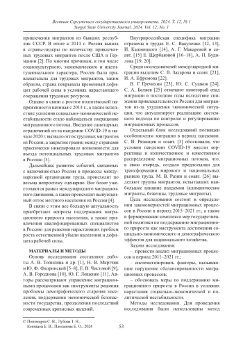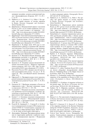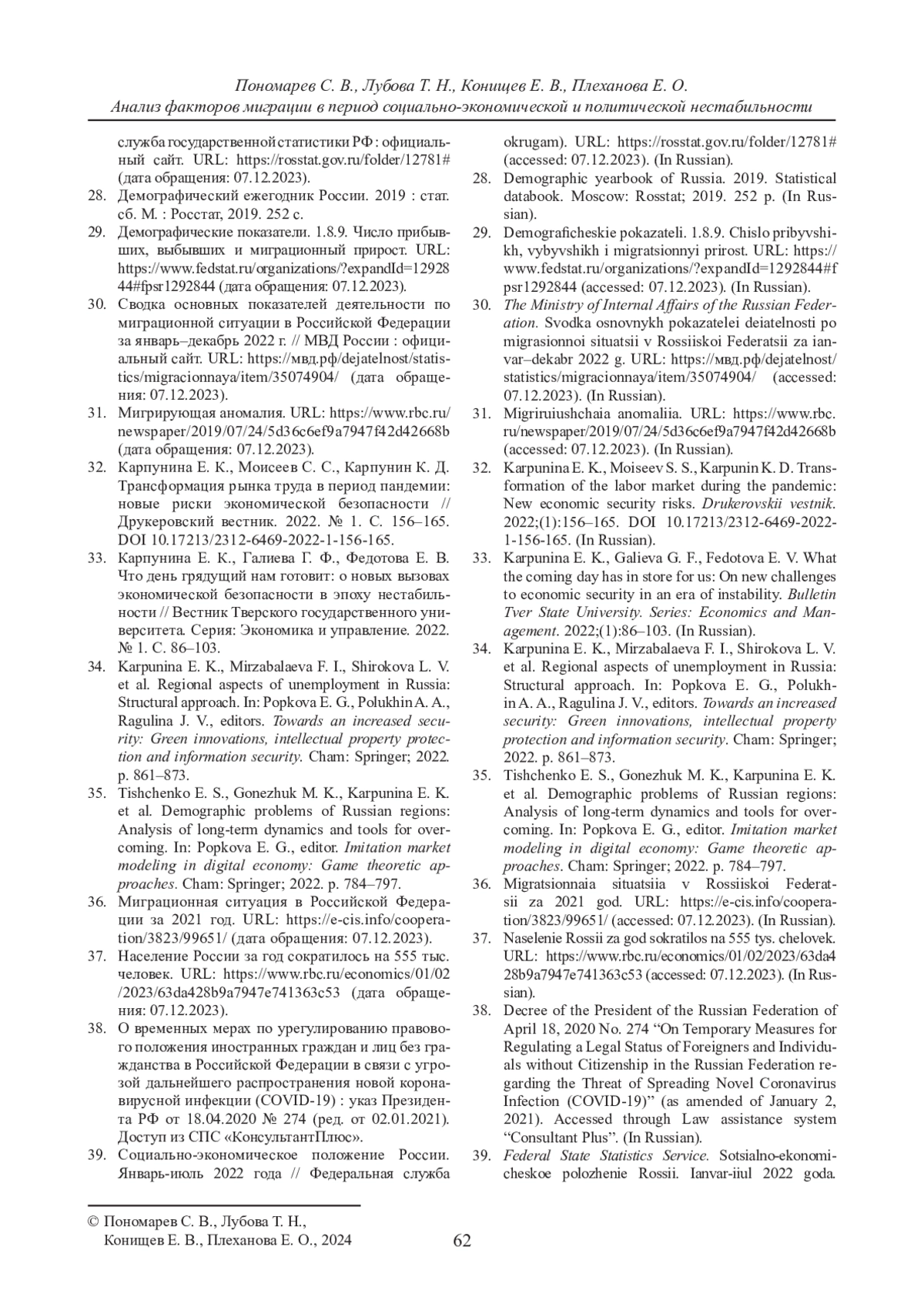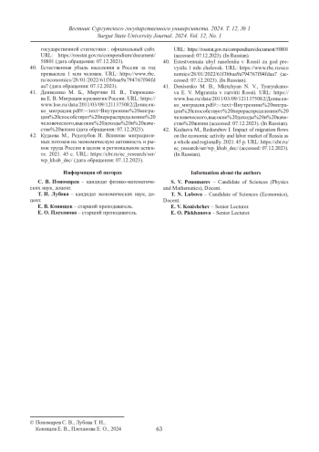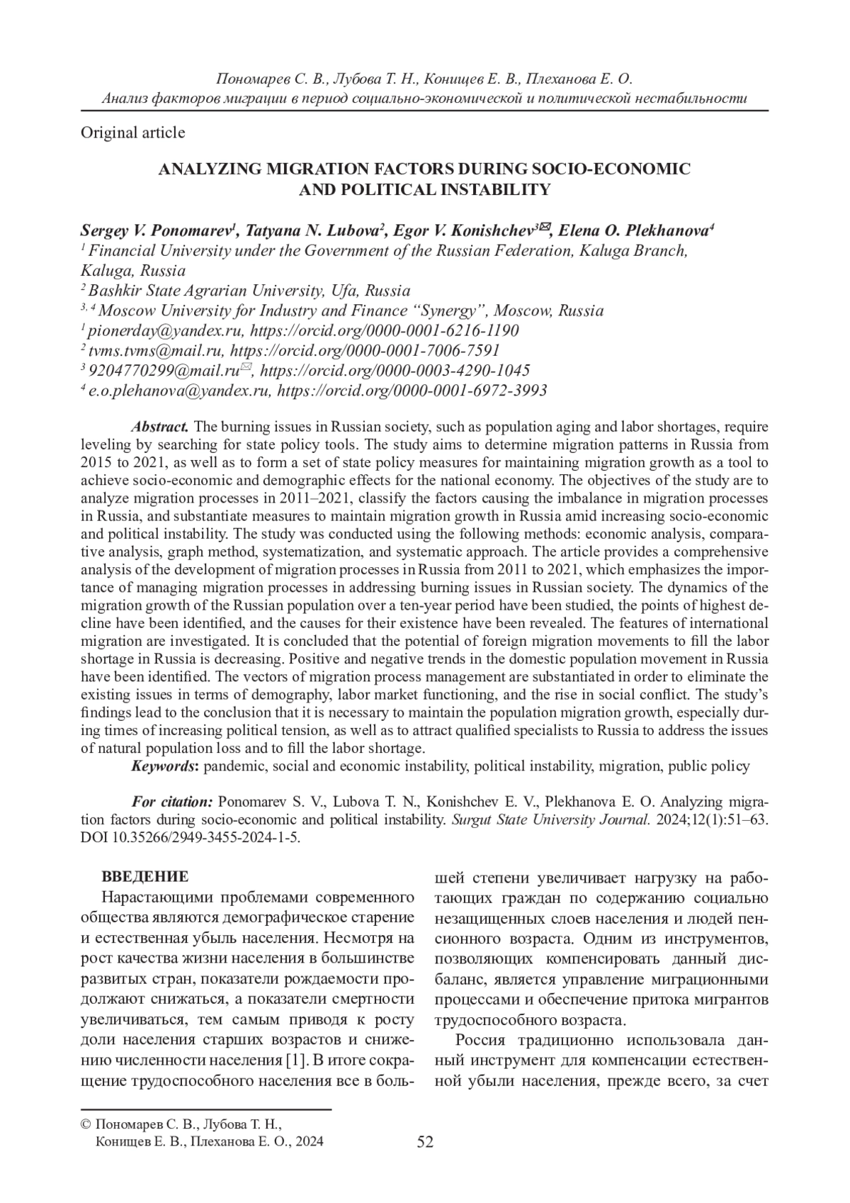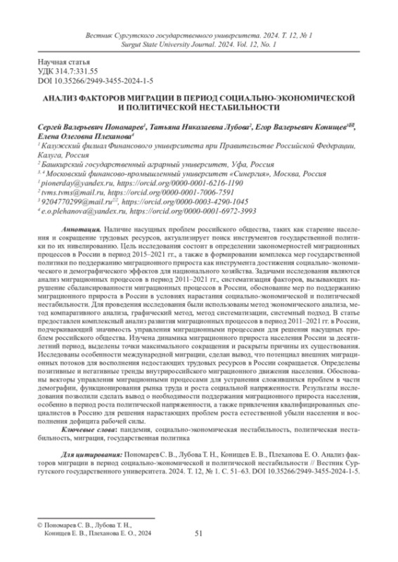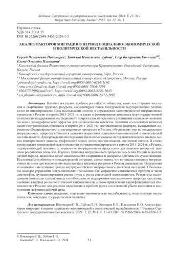 ПОНОМАРЕВ С. В., ЛУБОВА Т. Н., КОНИЩЕВ Е. В., ПЛЕХАНОВА Е. О. АНАЛИЗ ФАКТОРОВ МИГРАЦИИ В ПЕРИОД СОЦИАЛЬНО-ЭКОНОМИЧЕСКОЙ И ПОЛИТИЧЕСКОЙ НЕСТАБИЛЬНОСТИ // ВЕСТНИК СУРГУТСКОГО ГОСУДАРСТВЕННОГО УНИВЕРСИТЕТА. 2024. ТОМ 12, № 1