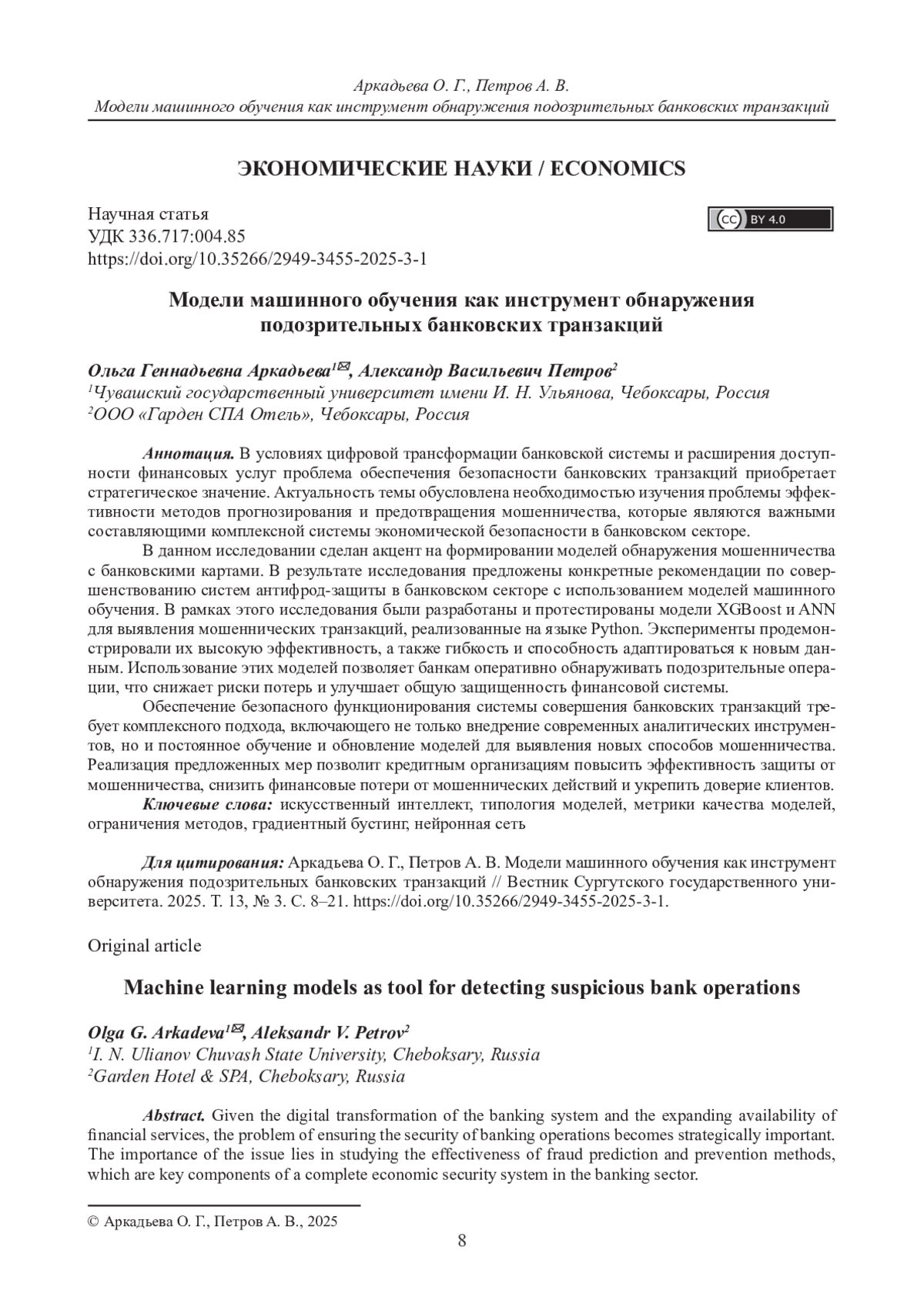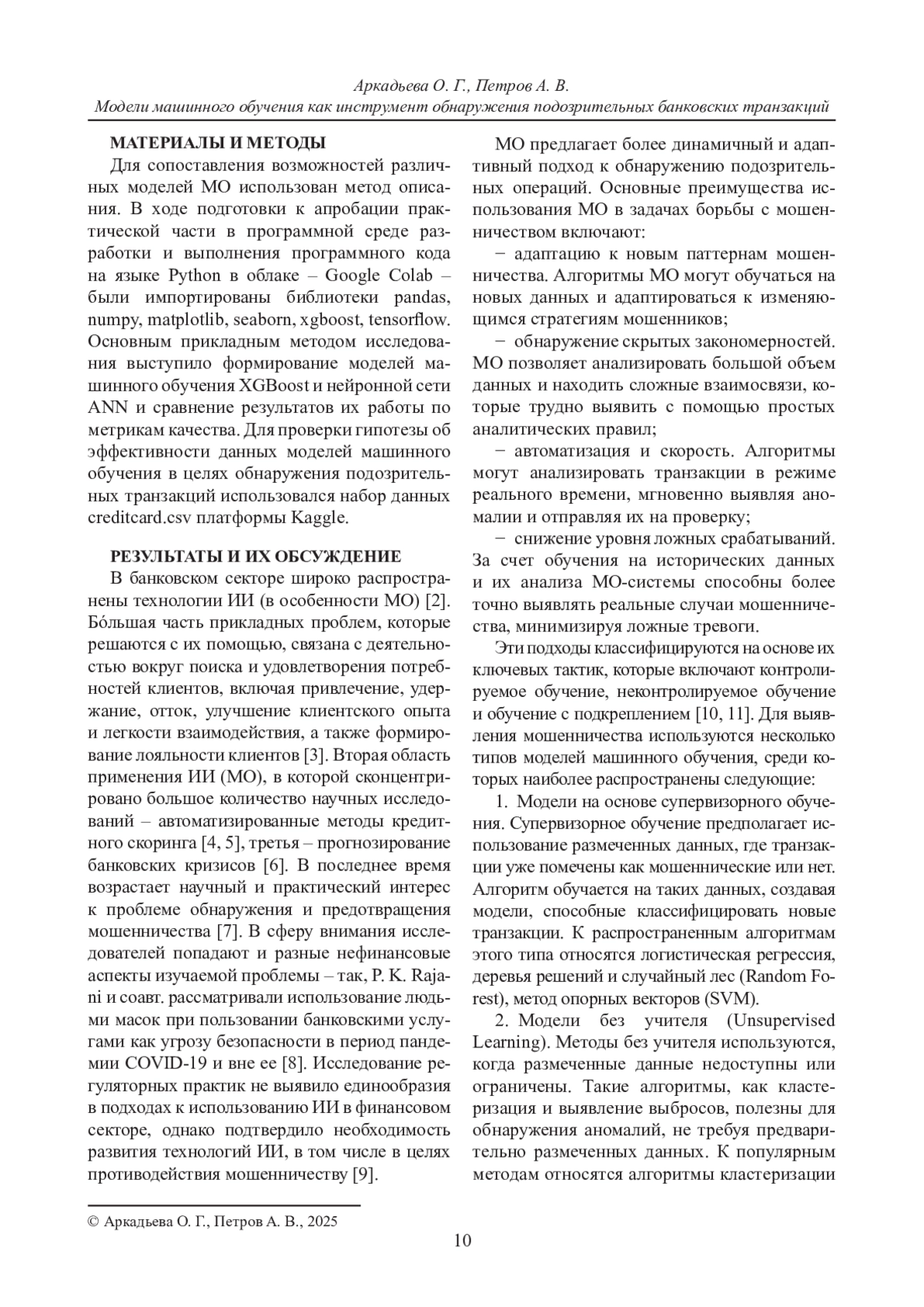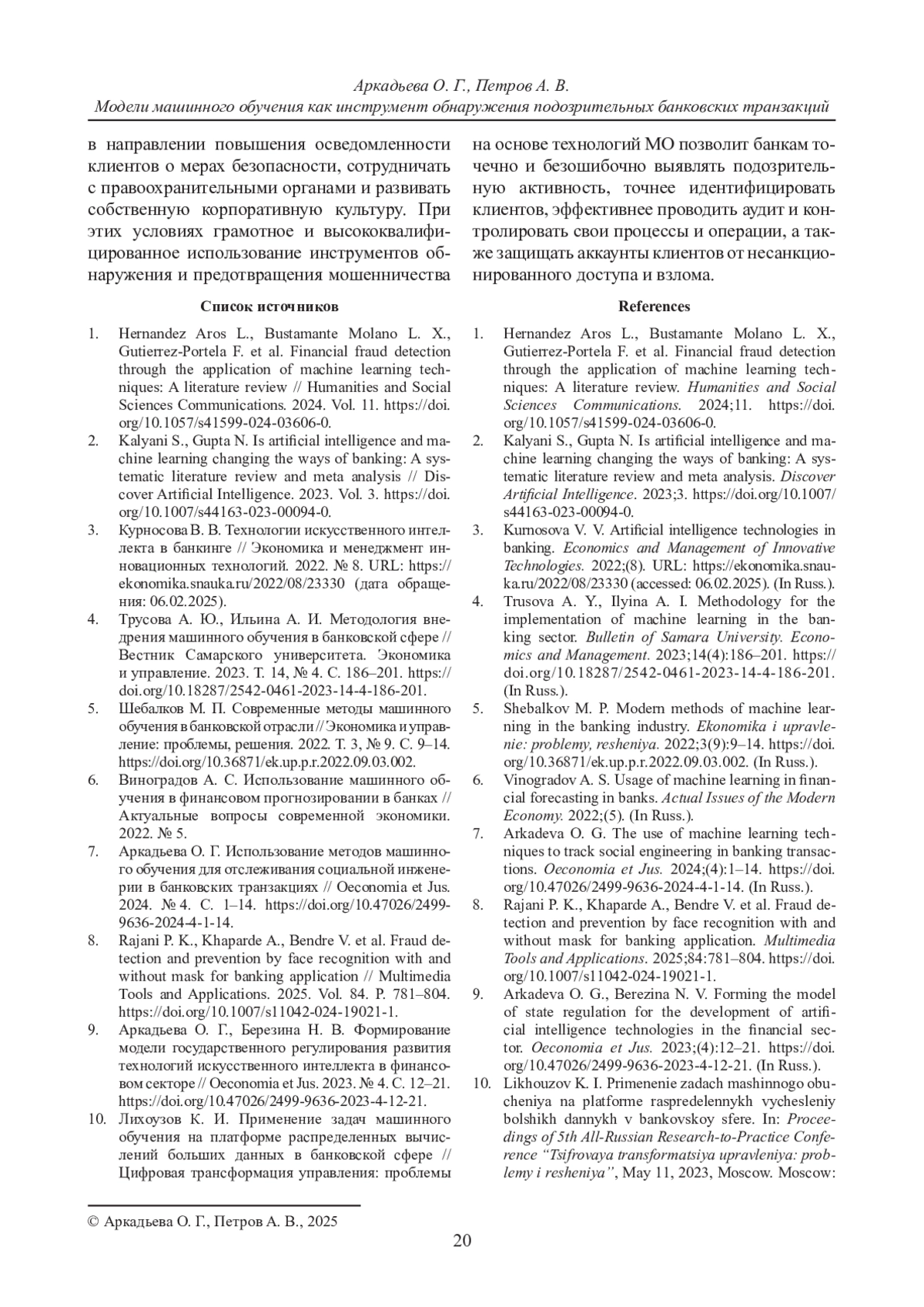 7. Аркадьева О. Г. Использование методов машинного обучения для отслеживания социальной инженерии в банковских транзакциях // Oeconomia et Jus. 2024. № 4. С. 1-14. https://doi.org/10.47026/2499-9636-2024-4-1-14.