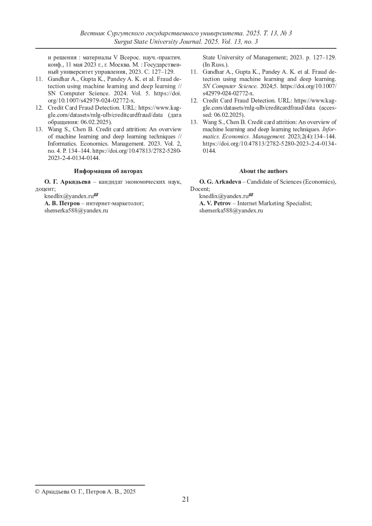 13. Wang S., Chen B. Credit card attrition: An overview of machine learning and deep learning techniques // Informatics. Economics. Management. 2023. Vol. 2, no. 4. P. 134-144. https://doi.org/10.47813/2782-5280-2023-2-4-0134-0144.