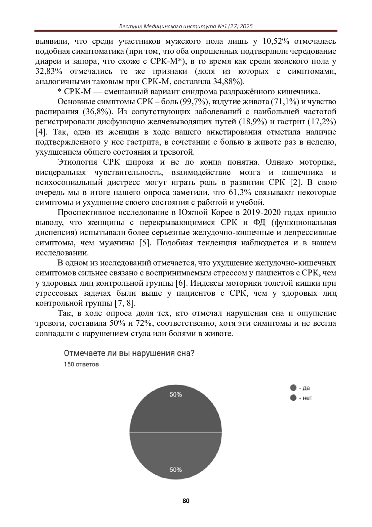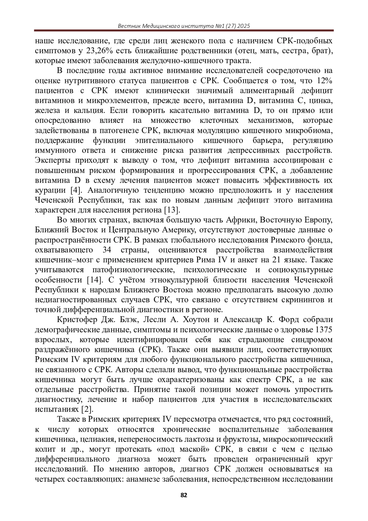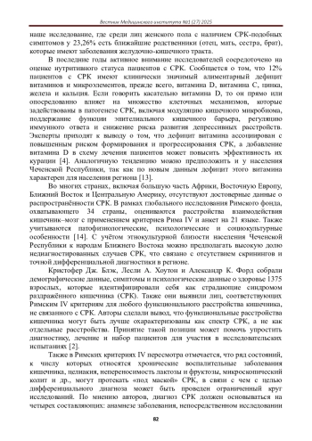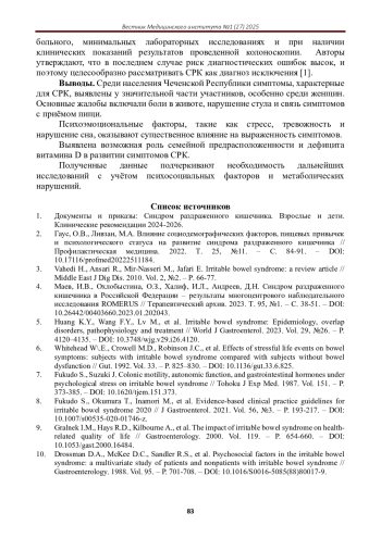 2. Гаус, О.В., Ливзан, М.А. Влияние социодемографических факторов, пищевых привычек и психологического статуса на развитие синдрома раздраженного кишечника // Профилактическая медицина. 2022. Т. 25, №11. - С. 84-91. -. DOI: 10.17116/profmed20222511184 EDN: LZSNGW