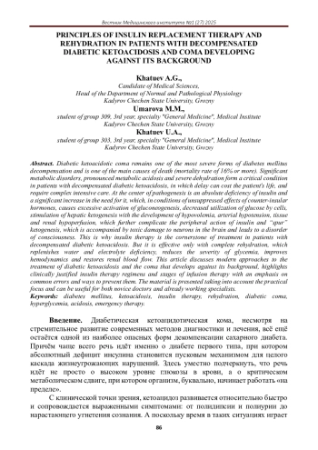 ХАТУЕВ А.Г., ХАТУЕВ У., УМАРОВА М.М. ПРИНЦИПЫ ЗАМЕСТИТЕЛЬНОЙ ИНСУЛИНОТЕРАПИИ И РЕГИДРАТАЦИИ У ПАЦИЕНТОВ С ДЕКОМПЕНСИРОВАННЫМ ДИАБЕТИЧЕСКИМ КЕТОАЦИДОЗОМ И РАЗВИВАЮЩЕЙСЯ НА ЕГО ФОНЕ КОМЫ // ВЕСТНИК МЕДИЦИНСКОГО ИНСТИТУТА. 2025. № 1 (27)