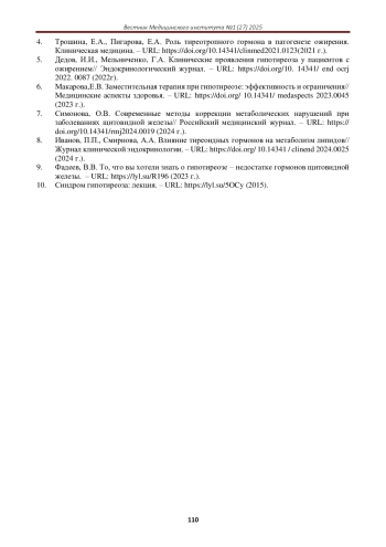1. Zakharova, S.M., Savelieva, L.V., Fadeeva, M.I. Ожирение и гипотериоз. Ожирение и метаболизм. - URL: 10.14341/2071-8713-4826 (2013 г.). DOI: 10.14341/2071-8713-4826(2013