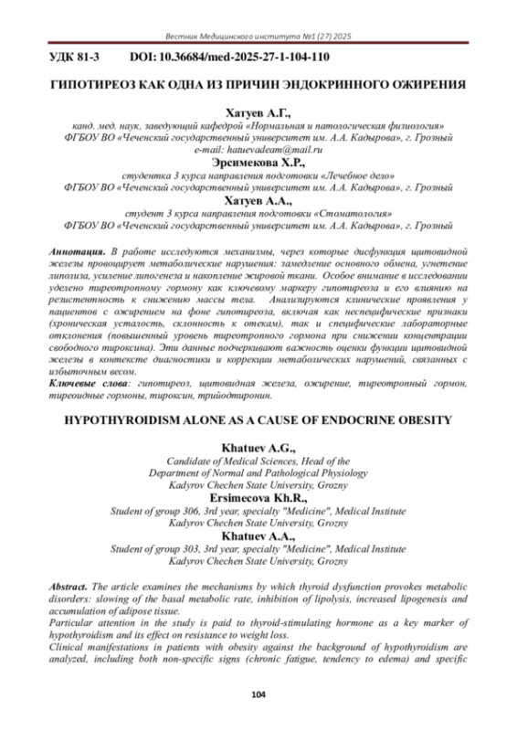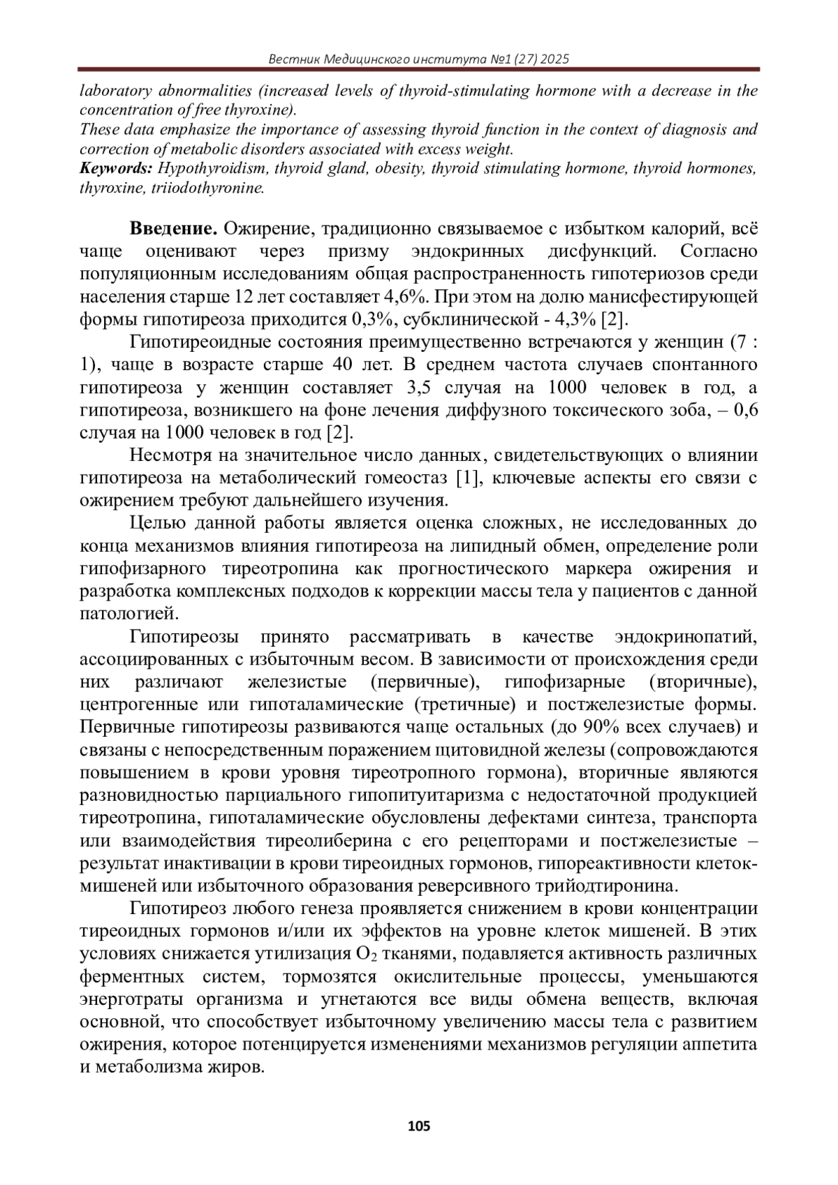 В работе исследуются механизмы, через которые дисфункция щитовидной железы провоцирует метаболические нарушения: замедление основного обмена, угнетение липолиза, усиление липогенеза и накопление жировой ткани. Особое внимание в исследовании уделено тиреотропному гормону как ключевому маркеру гипотиреоза и его влиянию на резистентность к снижению массы тела. Анализируются клинические проявления у пациентов с ожирением на фоне гипотиреоза, включая как неспецифические признаки (хроническая усталость, склонность к отекам), так и специфические лабораторные отклонения (повышенный уровень тиреотропного гормона при снижении концентрации свободного тироксина). Эти данные подчеркивают важность оценки функции щитовидной железы в контексте диагностики и коррекции метаболических нарушений, связанных с избыточным весом.
