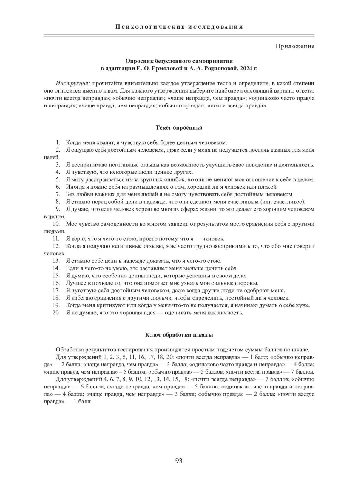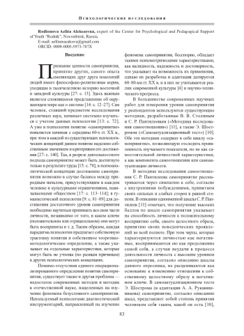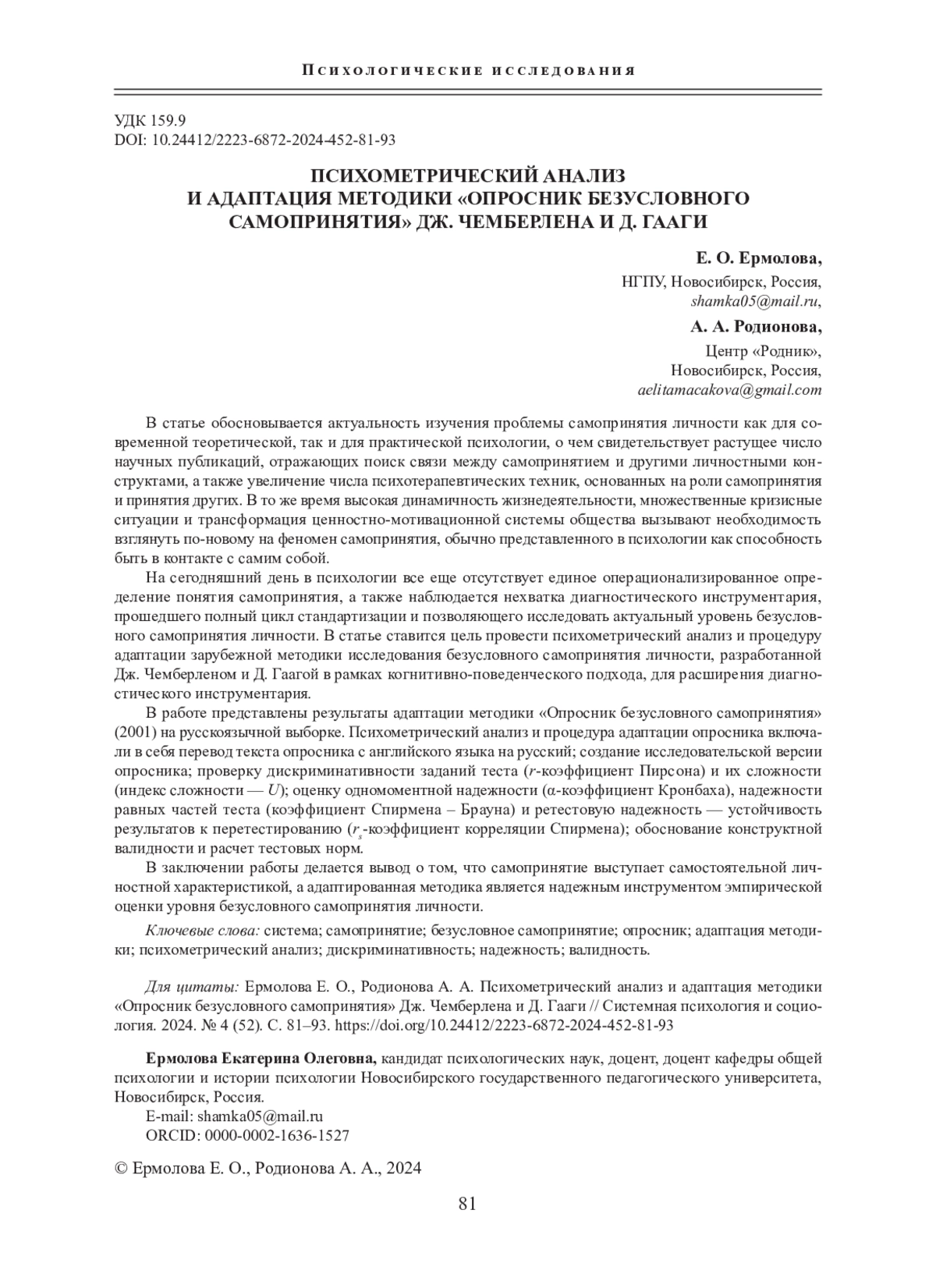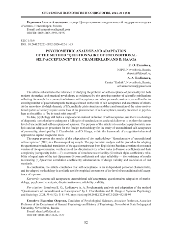 В работе представлены результаты адаптации методики «Опросник безусловного самопринятия» (2001) на русскоязычной выборке. Психометрический анализ и процедура адаптации опросника включали в себя перевод текста опросника с английского языка на русский; создание исследовательской версии опросника; проверку дискриминативности заданий теста ( r -коэффициент Пирсона) и их сложности (индекс сложности - U ); оценку одномоментной надежности (α-коэффициент Кронбаха), надежности равных частей теста (коэффициент Спирмена - Брауна) и ретестовую надежность - устойчивость результатов к перетестированию ( rs -коэффициент корреляции Спирмена); обоснование конструктной валидности и расчет тестовых норм.