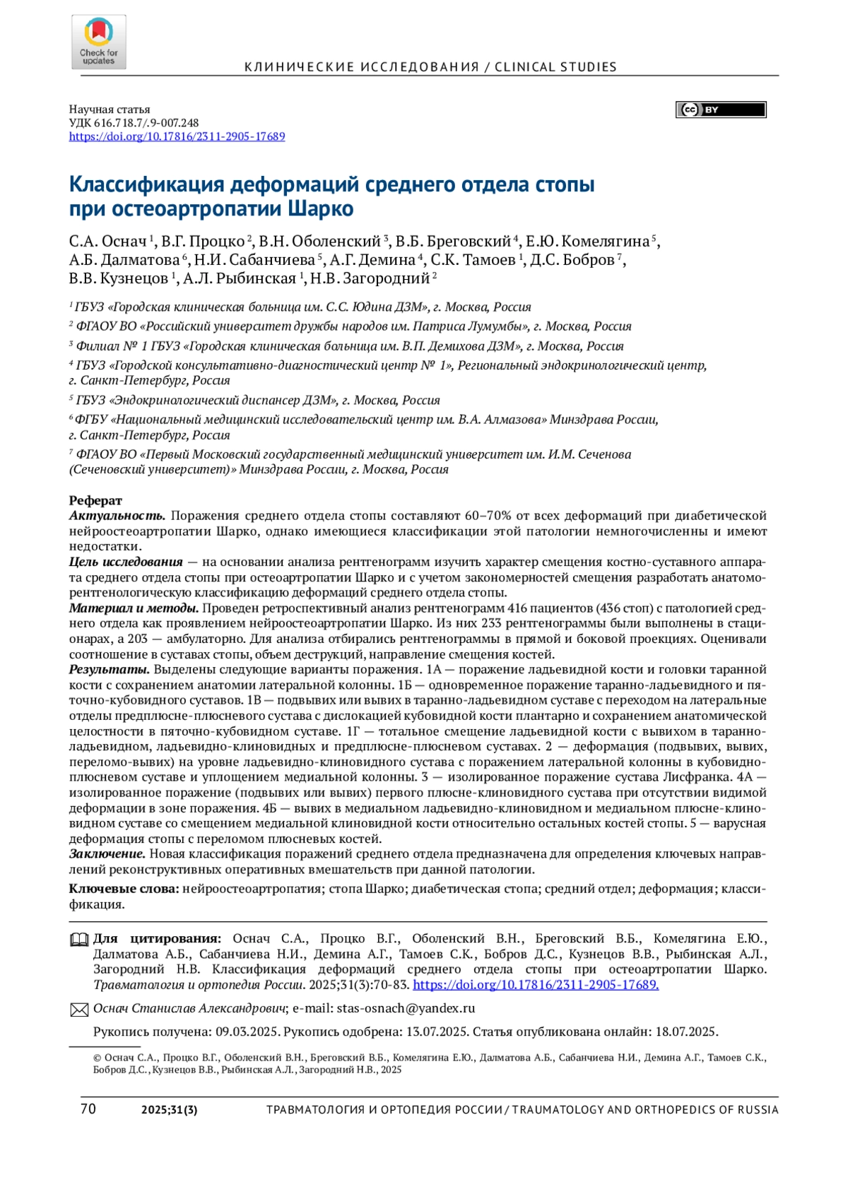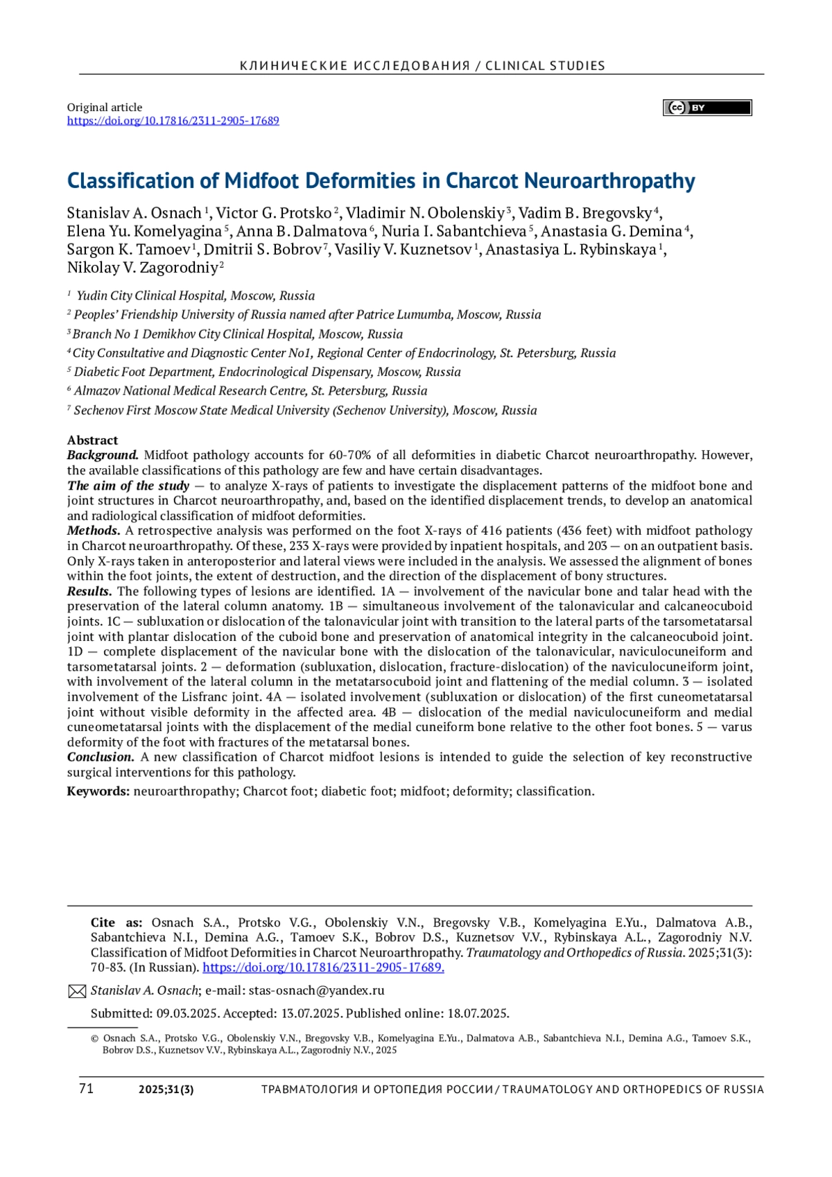 Актуальность. Поражения среднего отдела стопы составляют 60–70% от всех деформаций при диабетической нейроостеоартропатии Шарко, однако имеющиеся классификации этой патологии немногочисленны и имеют недостатки.