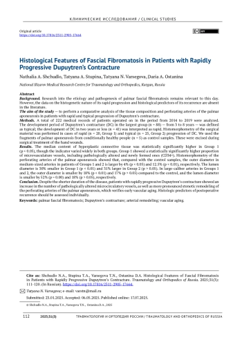 Заключение. Несмотря на меньшую давность заболевания, у пациентов с быстрым прогрессированием контрактуры Дюпюитрена выявлено увеличение численности патологически измененных сосудов микроциркуляторного русла и более выраженное стенотическое ремоделирование перфорантных артерий ладонного апоневроза, что верифицирует раннее сосудистое старение. Гистологические предикторы послеоперационного рецидивирования необходимо оценивать индивидуально