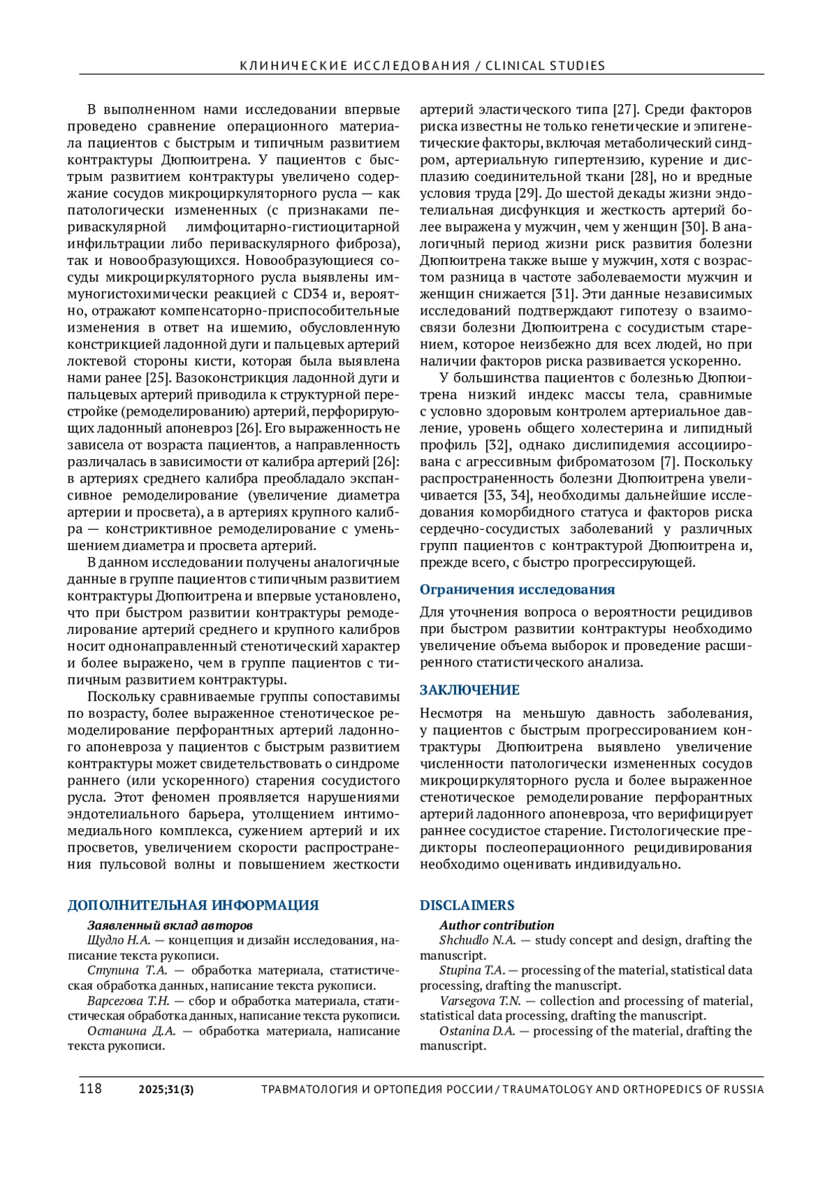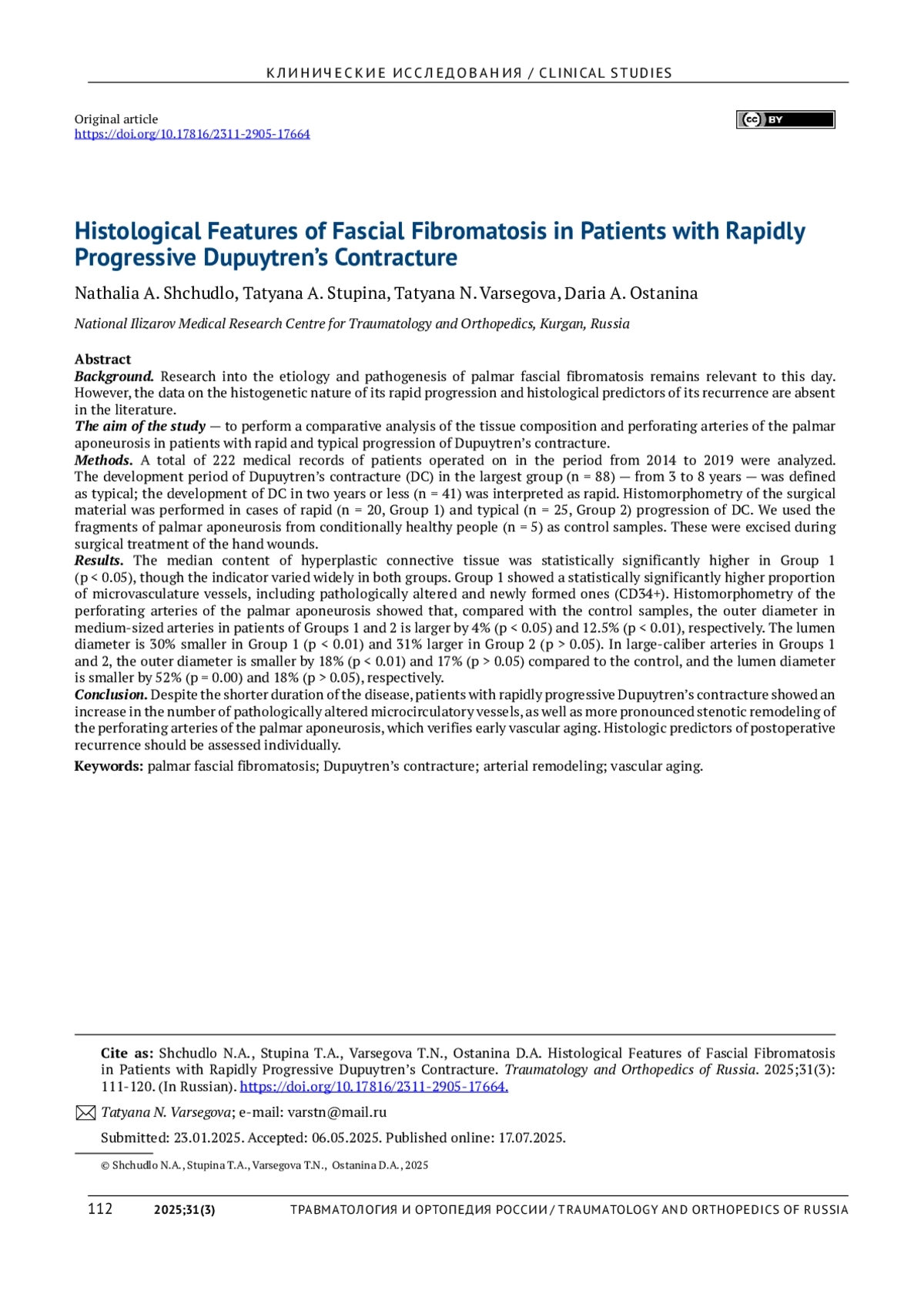 26. Щудло Н.А., Варсегова Т.Н., Ступина Т.Н., Щудло М.М. Типы и стадии сосудистого ремоделирования при контрактуре Дюпюитрена (анализ 506 артерий в операционном материале 111 пациентов). Гений ортопедии. 2020;26(2):179-184.
