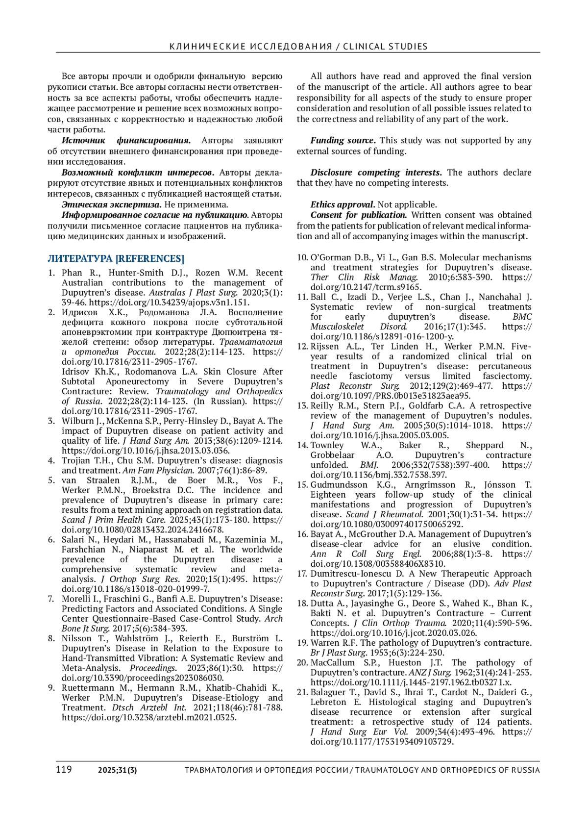 18. Dutta A., Jayasinghe G., Deore S., Wahed K., Bhan K., Bakti N. et al. Dupuytren’s Contracture - Current Concepts. J Clin Orthop Trauma. 2020;11(4):590-596. DOI: 10.1016/j.jcot.2020.03.026