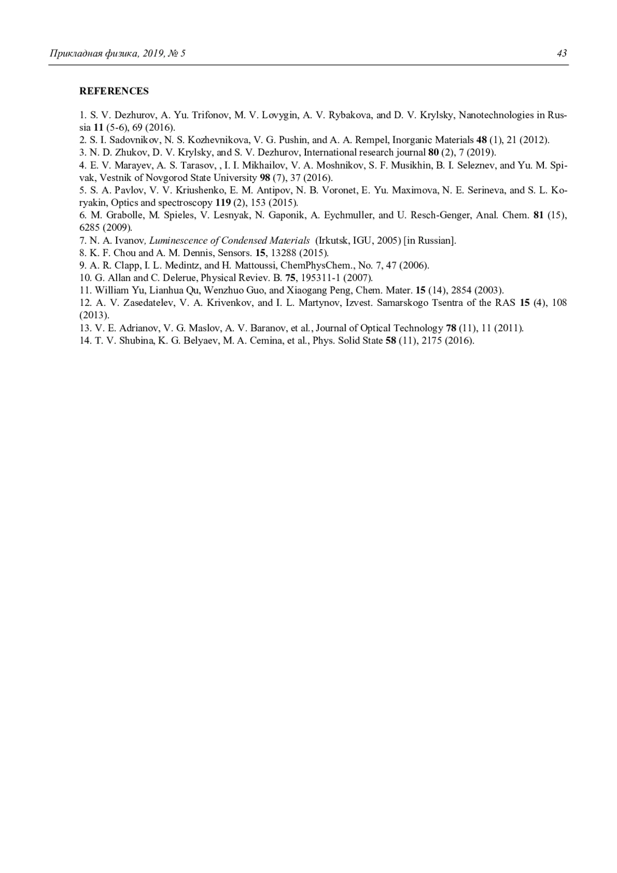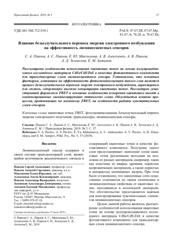 ПАВЛОВ С. А., ПАВЛОВ А. С., МАКСИМОВА Е. Ю., АЛЕКСЕЕНКО А. В., ПАВЛОВ А. В., ЗЕЛЕНСКАЯ А. Д., АНТИПОВ Е. М. ВЛИЯНИЕ БЕЗЫЗЛУЧАТЕЛЬНОГО ПЕРЕНОСА ЭНЕРГИИ ЭЛЕКТРОННОГО ВОЗБУЖДЕНИЯ НА ЭФФЕКТИВНОСТЬ ЛЮМИНЕСЦЕНТНЫХ СЕНСОРОВ // ПРИКЛАДНАЯ ФИЗИКА. 2019. №5