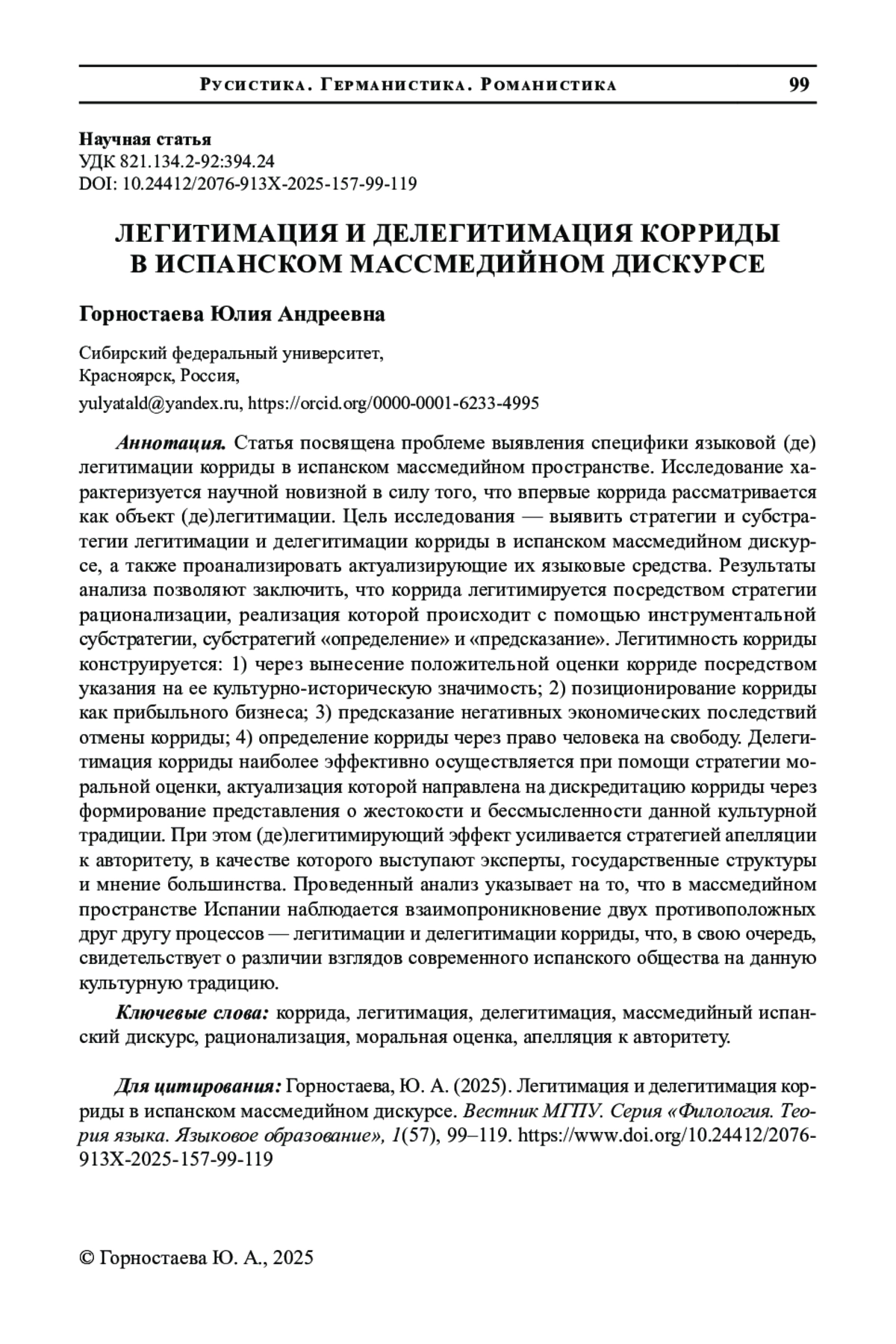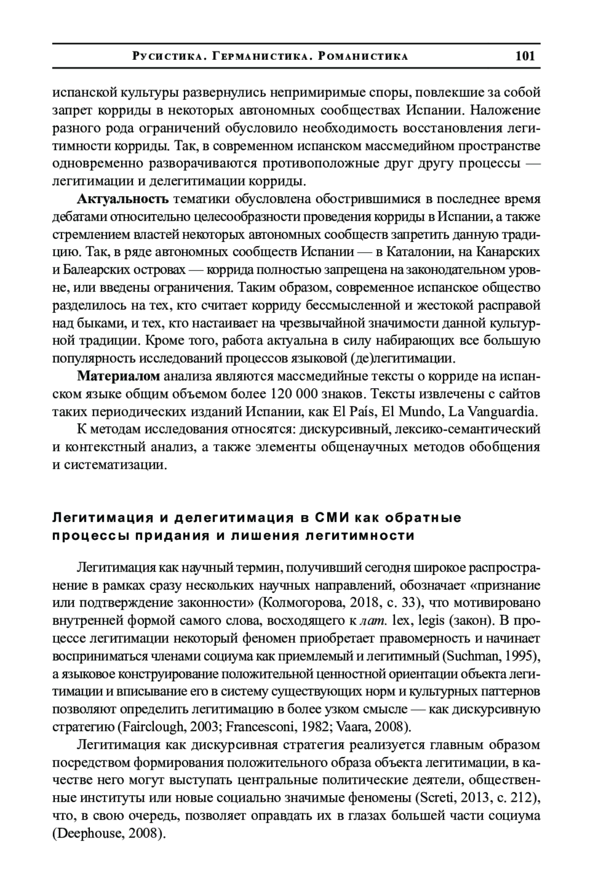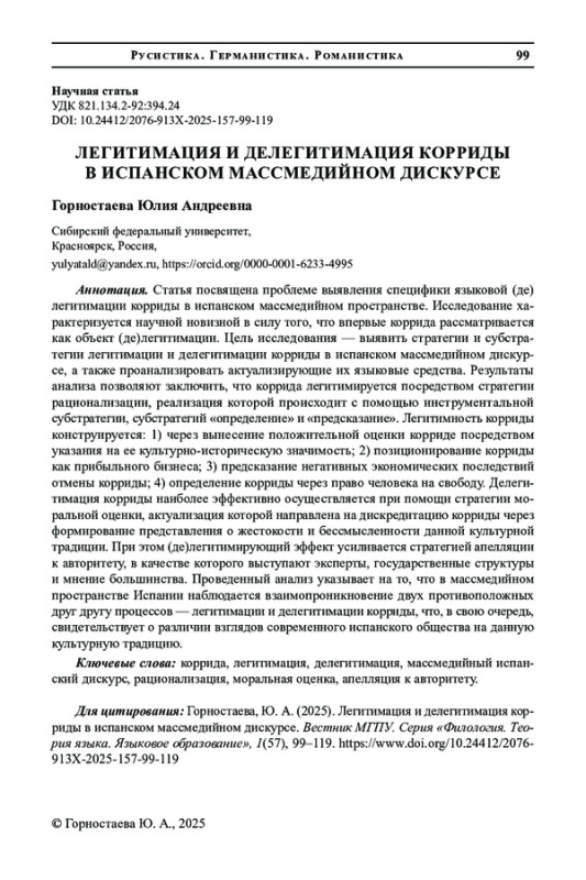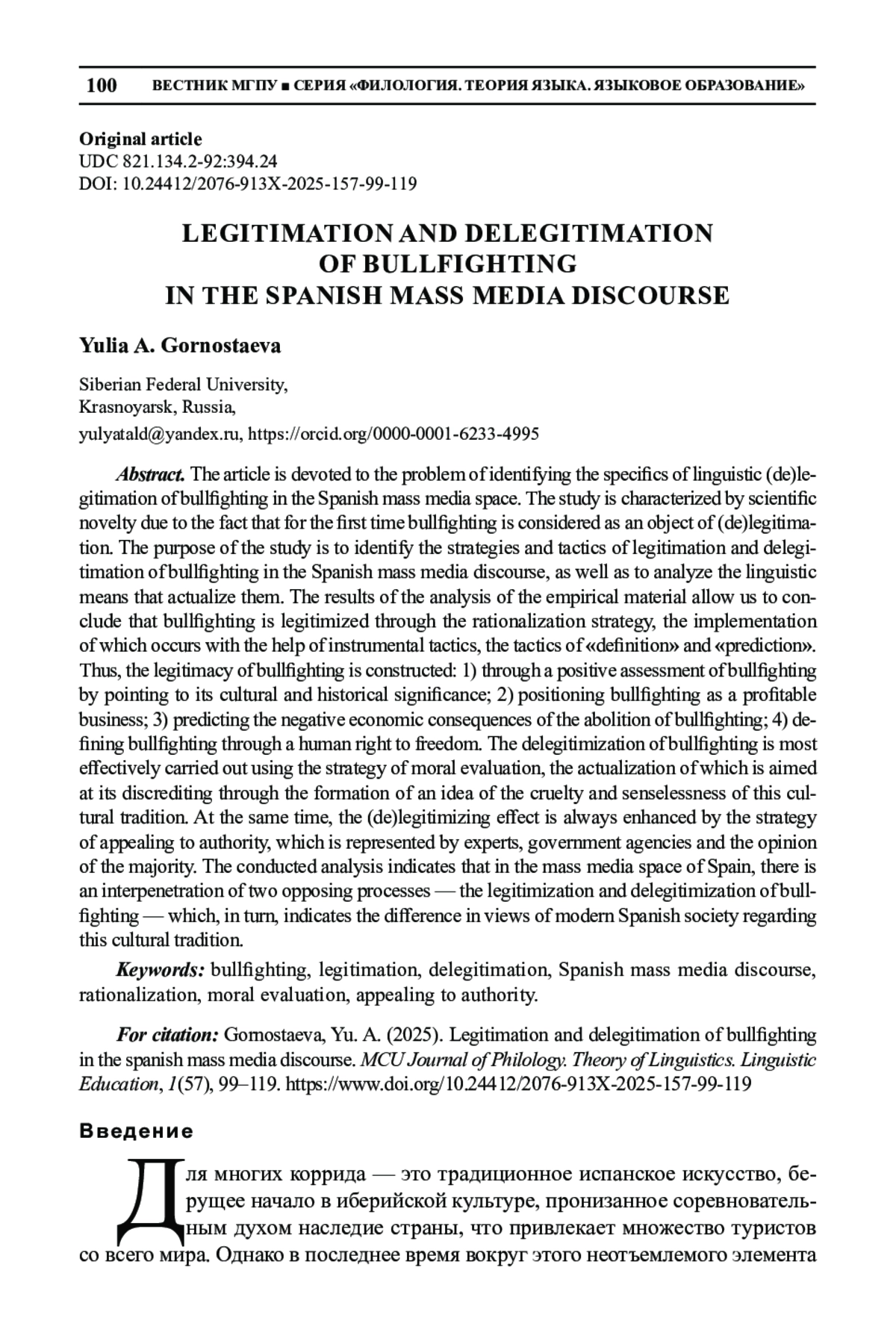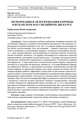 Статья посвящена проблеме выявления специфики языковой (де) легитимации корриды в испанском массмедийном пространстве. Исследование характеризуется научной новизной в силу того, что впервые коррида рассматривается как объект (де)легитимации. Цель исследования - выявить стратегии и субстратегии легитимации и делегитимации корриды в испанском массмедийном дискурсе, а также проанализировать актуализирующие их языковые средства. Результаты анализа позволяют заключить, что коррида легитимируется посредством стратегии рационализации, реализация которой происходит с помощью инструментальной субстратегии, субстратегий «определение» и «предсказание». Легитимность корриды конструируется: 1) через вынесение положительной оценки корриде посредством указания на ее культурно-историческую значимость; 2) позиционирование корриды как прибыльного бизнеса; 3) предсказание негативных экономических последствий отмены корриды; 4) определение корриды через право человека на свободу. Делегитимация корриды наиболее эффективно осуществляется при помощи стратегии моральной оценки, актуализация которой направлена на дискредитацию корриды через формирование представления о жестокости и бессмысленности данной культурной традиции. При этом (де)легитимирующий эффект усиливается стратегией апелляции к авторитету, в качестве которого выступают эксперты, государственные структуры и мнение большинства. Проведенный анализ указывает на то, что в массмедийном пространстве Испании наблюдается взаимопроникновение двух противоположных друг другу процессов - легитимации и делегитимации корриды, что, в свою очередь, свидетельствует о различии взглядов современного испанского общества на данную культурную традицию.