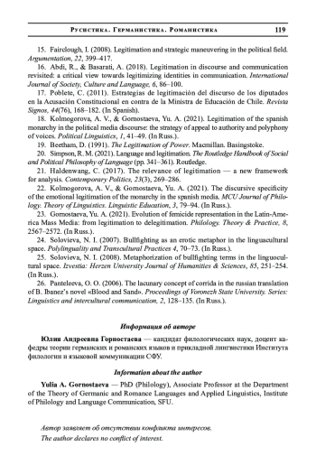 22. Колмогорова, А. В., & Горностаева, Ю. А. (2021). Дискурсивная специфика эмоциональной легитимации монархии в испанских СМИ. Вестник МГПУ. Серия “Филология. Теория языка. Языковое образование”, 3, 79-94. EDN: NUCDXU