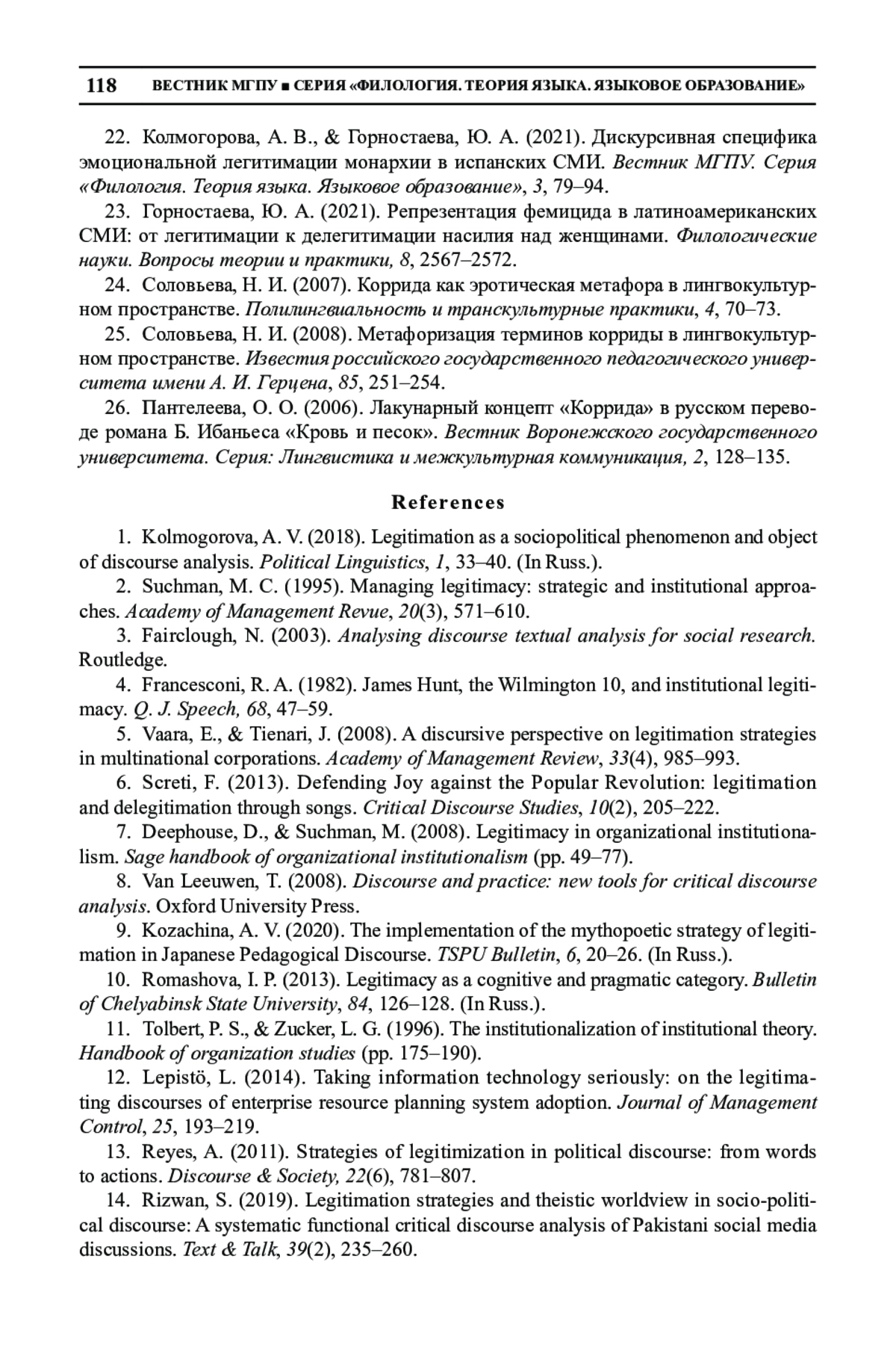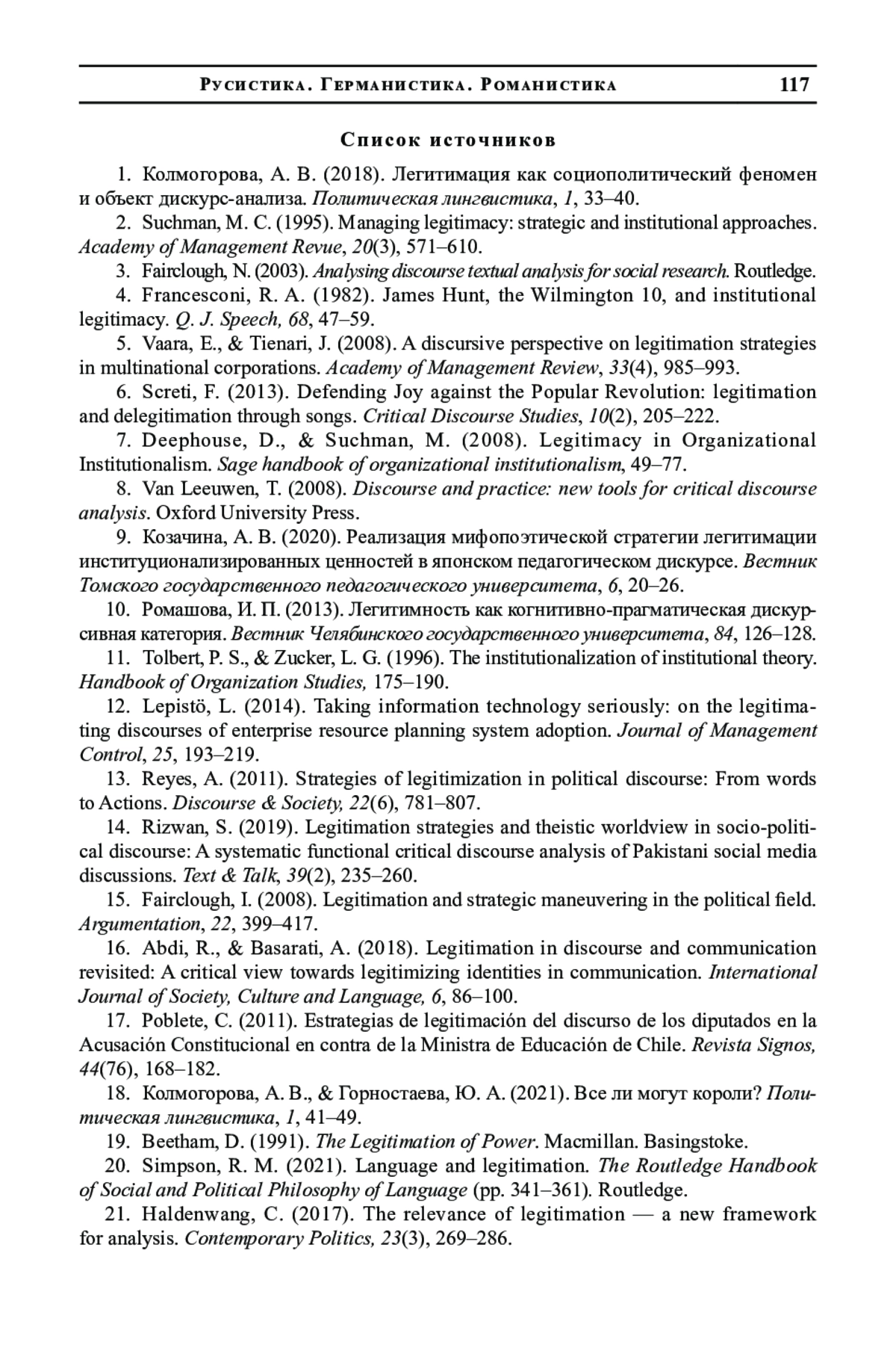 1. Колмогорова, А. В. (2018). Легитимация как социополитический феномен и объект дискурс-анализа. Политическая лингвистика, 1, 33-40. EDN: YSUNKN