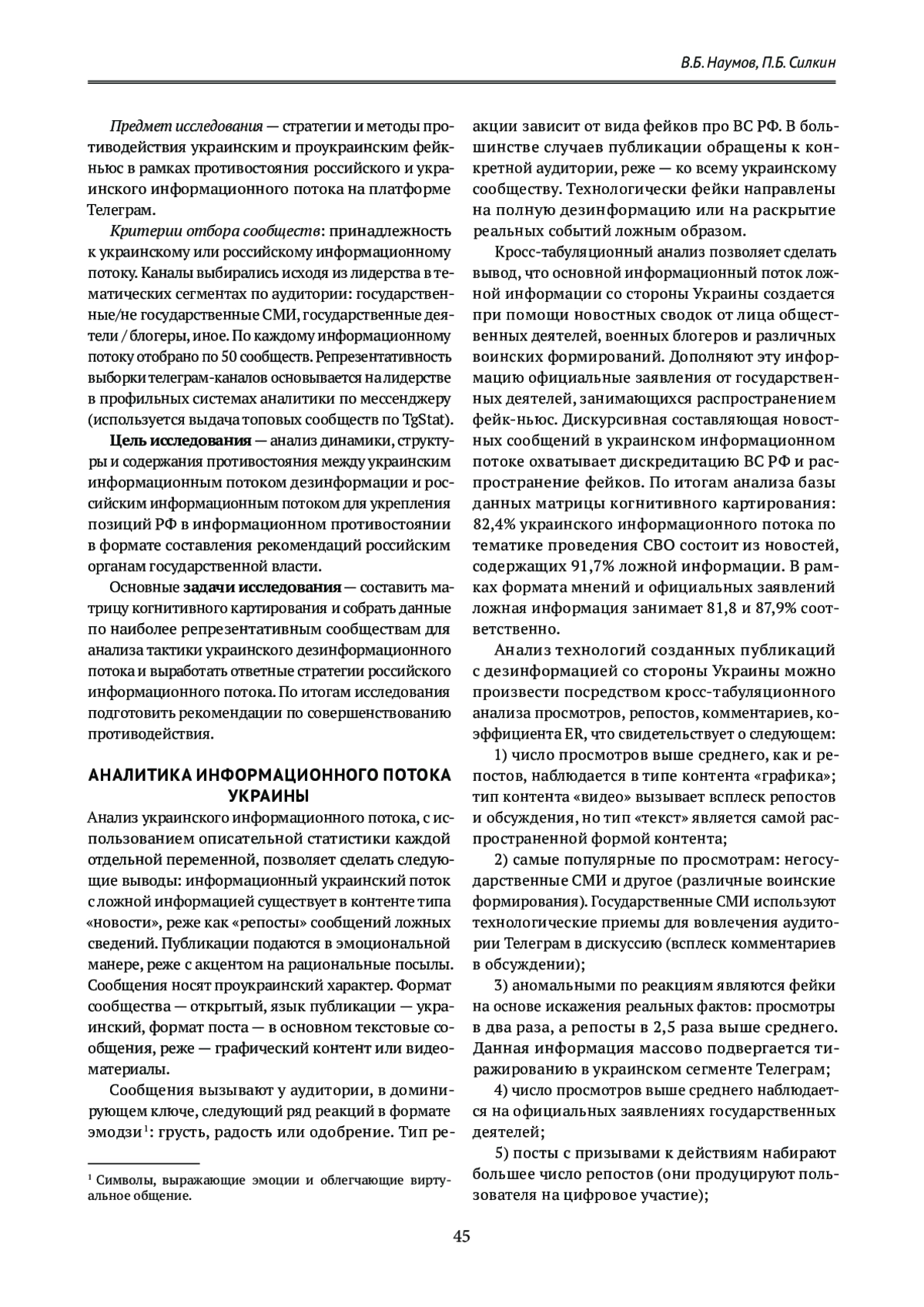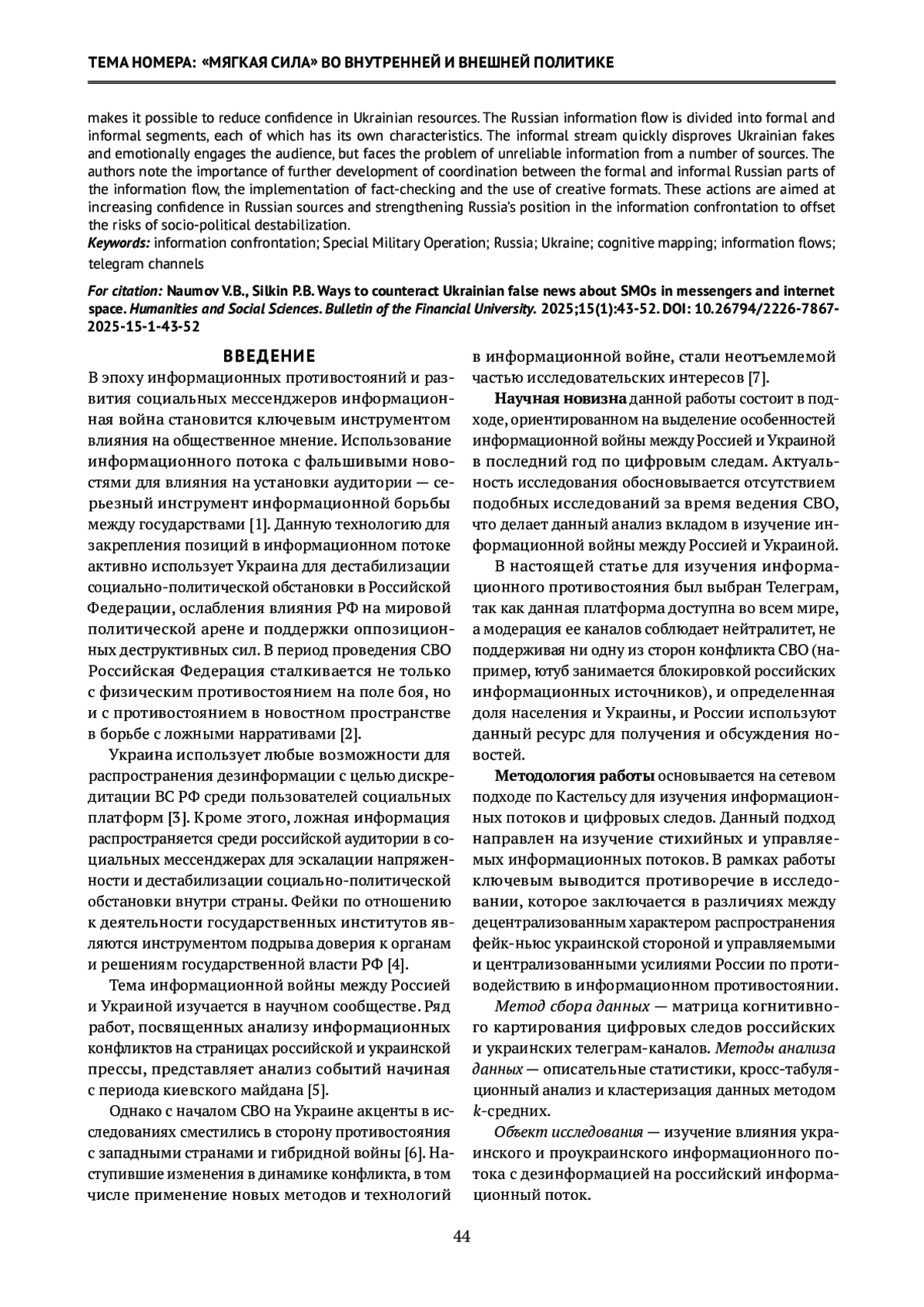 В статье рассматриваются особенности противодействия ложной информации о ходе проведения СВО на Украине в социальном мессенджере Телеграм. Исследование направлено на выявление ключевых стратегий и тактик украинского и российского информационных потоков, а также анализ сильных и слабых сторон для формирования сценариев усиления России в информационном противостоянии. Используя методы когнитивного картирования, корреляционного и кластерного анализа, авторы изучили особенности контента, вовлеченности аудитории и структуры распространения информации. Украинская сторона активно использует дезинформацию, обращаясь к эмоциональному восприятию аудитории и призывая к обсуждению в открытых сообществах для дискредитации российских государственных институтов. Ключевой особенностью украинского информационного потока являются оперативность распространения фальсификаций и вариативность их форматов, однако высокая частота разоблачения фейков позволяет снижать доверие к украинским ресурсам. Российский информационный поток разделяется на формальный и неформальный сегменты, каждый из которых имеет свои особенности. Неформальный поток оперативно опровергает украинские фейки и эмоционально вовлекает аудиторию, однако сталкивается с проблемой недостоверной информации со стороны ряда источников. Авторы отмечают важность развития взаимодействия между формальными и неформальными частями российского информационного потока, внедрения фактчекинга и использования креативных форматов подачи информации. Данные меры направлены на повышение доверия к российским источникам и усиление позиций России в информационном противостоянии для нивелирования рисков социально-политической дестабилизации.