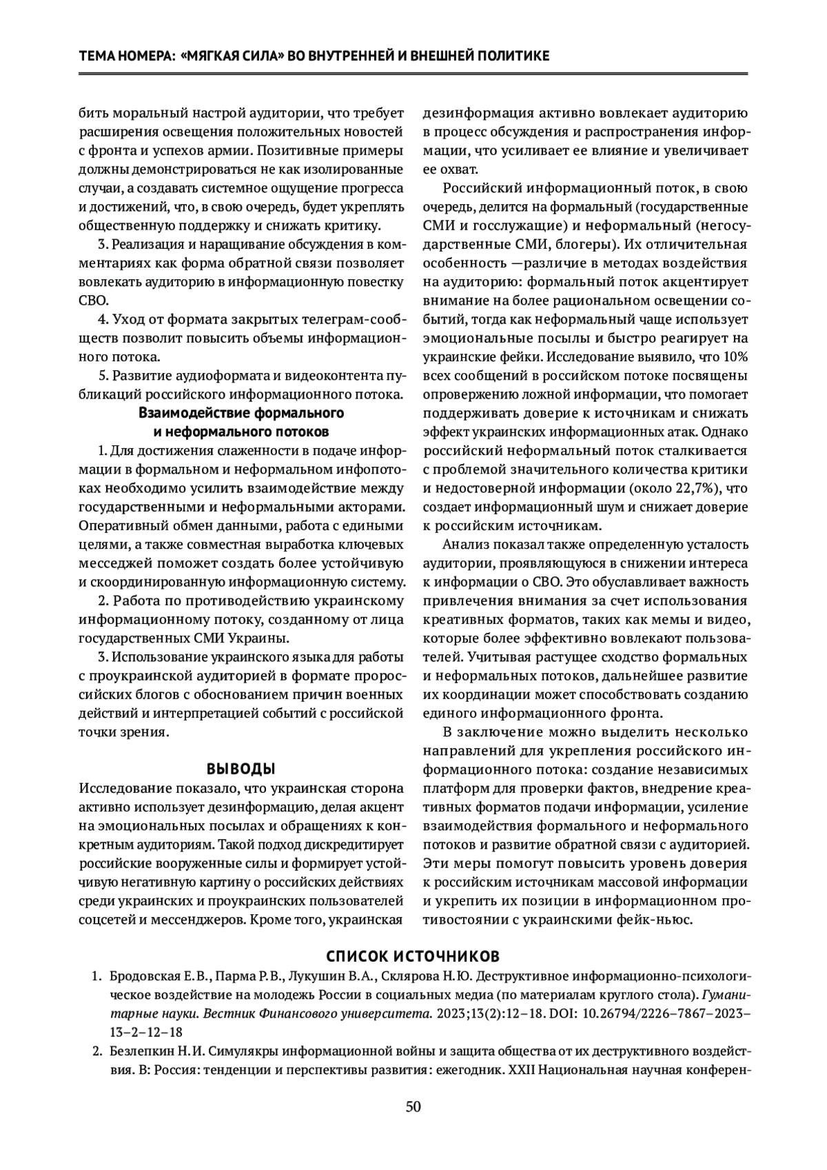 1. Бродовская Е. В., Парма Р. В., Лукушин В. А., Склярова Н. Ю. Деструктивное информационно-психологическое воздействие на молодежь России в социальных медиа (по материалам круглого стола). Гуманитарные науки. Вестник Финансового университета. 2023;13(2):12-18. https://doi.org/10.26794/2226-7867-2023- 13-2-12-18