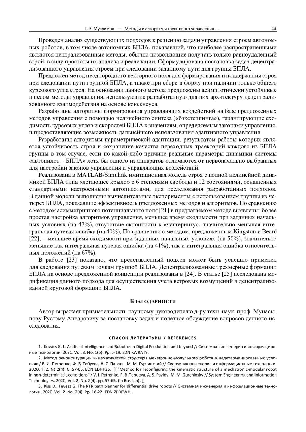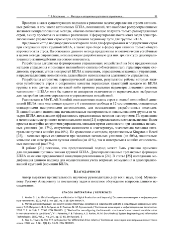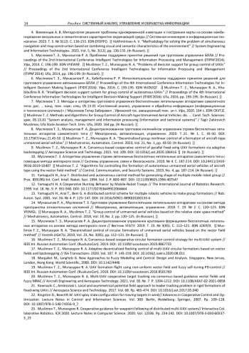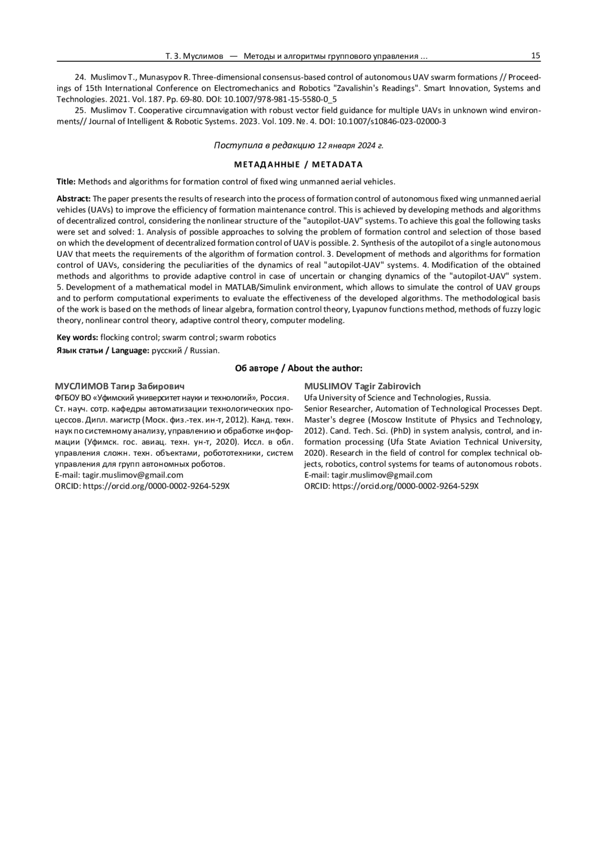 23. Muslimov T., Munasypov R. Cooperative guidance for waypoint following of distributed multi-UAV system// Interactive Collaborative Robotics. ICR 2020. Lecture Notes in Computer Science. 2020. Vol. 12336. Рp. 234-242. Т. З. Муслимов - Методы и алгоритмы группового управления... DOI: 10.1007/978-3-030-60337-3_2315