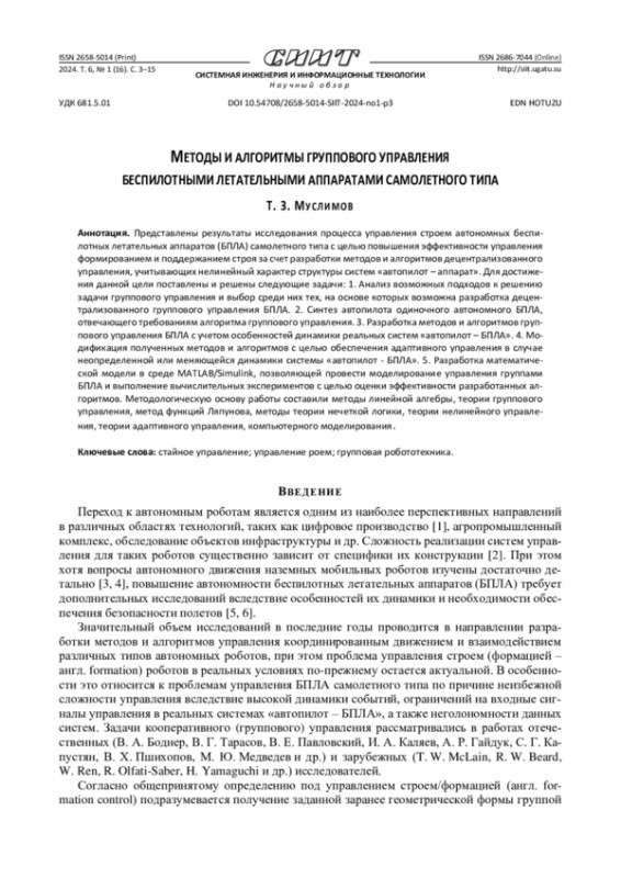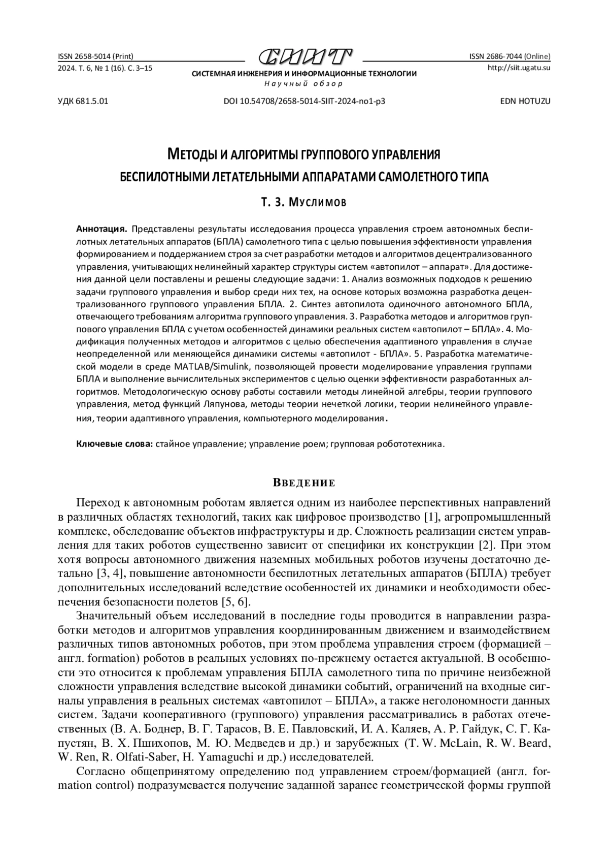 Muslimov T. Z. Methods and Algorithms for Group Control of Aircraft-type Unmanned Aerial Vehicles: dis.... Cand. Tech. Sciences: spec. 05.13.01 "System analysis, management and information processing (information and technical systems)" / Tagir Zabirovich Muslimov; Ufa State Aviation Tech. Univ. Ufa, 2020. 164 pp. (In Russian).