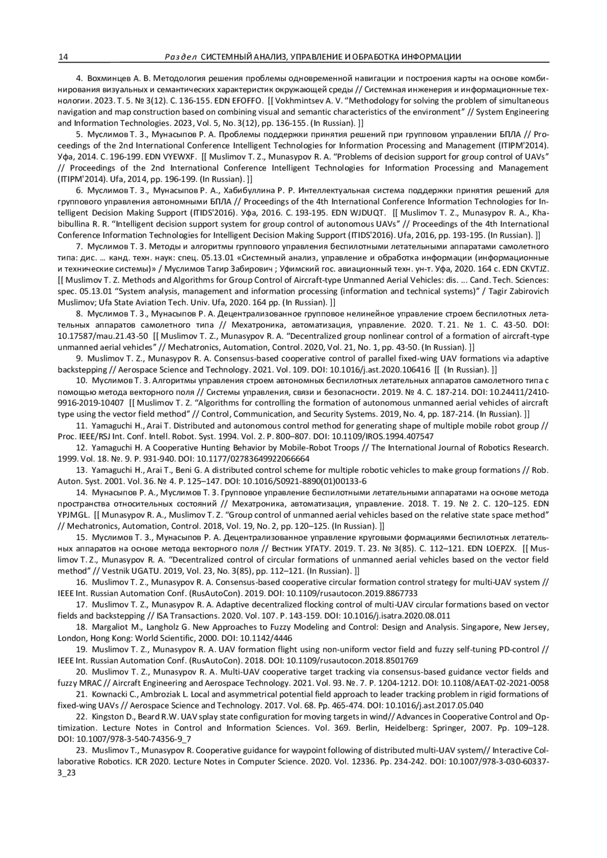 14. Мунасыпов Р. А., Муслимов Т. З. Групповое управление беспилотными летательными аппаратами на основе метода пространства относительных состояний // Мехатроника, автоматизация, управление. 2018. Т. 19. № 2. C. 120-125. EDN: YPJMGL