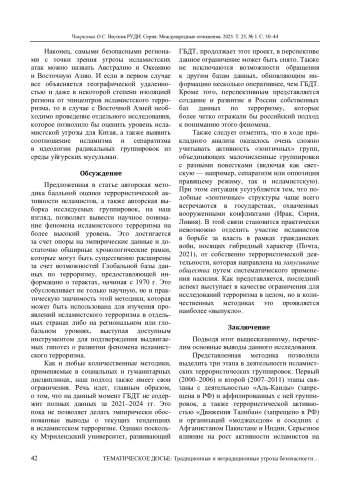 Цель исследования состоит в апробации методики балльной оценки террористической активности исламистских групп с привлечением эмпирических данных о количестве терактов, совершенных исламистами в 2000-2020 гг., и жертв этих атак. На основе Глобальной базы данных о терроризме и авторской выборки из 155 группировок, транслирующих исламистскую идеологию, выделено три этапа развития исламистского терроризма, подтверждено наличие прямой пропорциональной связи между количеством терактов и числом жертв в них, а также проанализирована география террористической деятельности исламистов. Методологически исследование опирается на сочетание двух подходов - изучения терроризма как политического явления и как формы религиозной манифестации, а сами исламистские террористические группировки рассматриваются как политические проекты, только маскирующиеся под сообщества, преследующие религиозные цели. Установлено, что теракты 11 сентября 2001 г. не оказали существенного влияния на активизацию терроризма исламистов в отличие от дестабилизации Ирака, который стал еще одной площадкой для подготовки террористов наряду с Афганистаном. Количественный анализ позволил установить, что Ближний Восток и Северная Африка ошибочно воспринимались как «эпицентр» исламистского терроризма в 2000-2020 гг., поскольку в 2000 г. первое место по числу терактов занимала Юго-Восточная Азия, а в 2003, 2005-2013 и 2018-2020 гг. лидером по этому показателю была Южная Азия. Обозначены возможности и ограничения предлагаемой методики, описаны перспективы ее дальнейшего применения в научных исследованиях исламистского терроризма.
