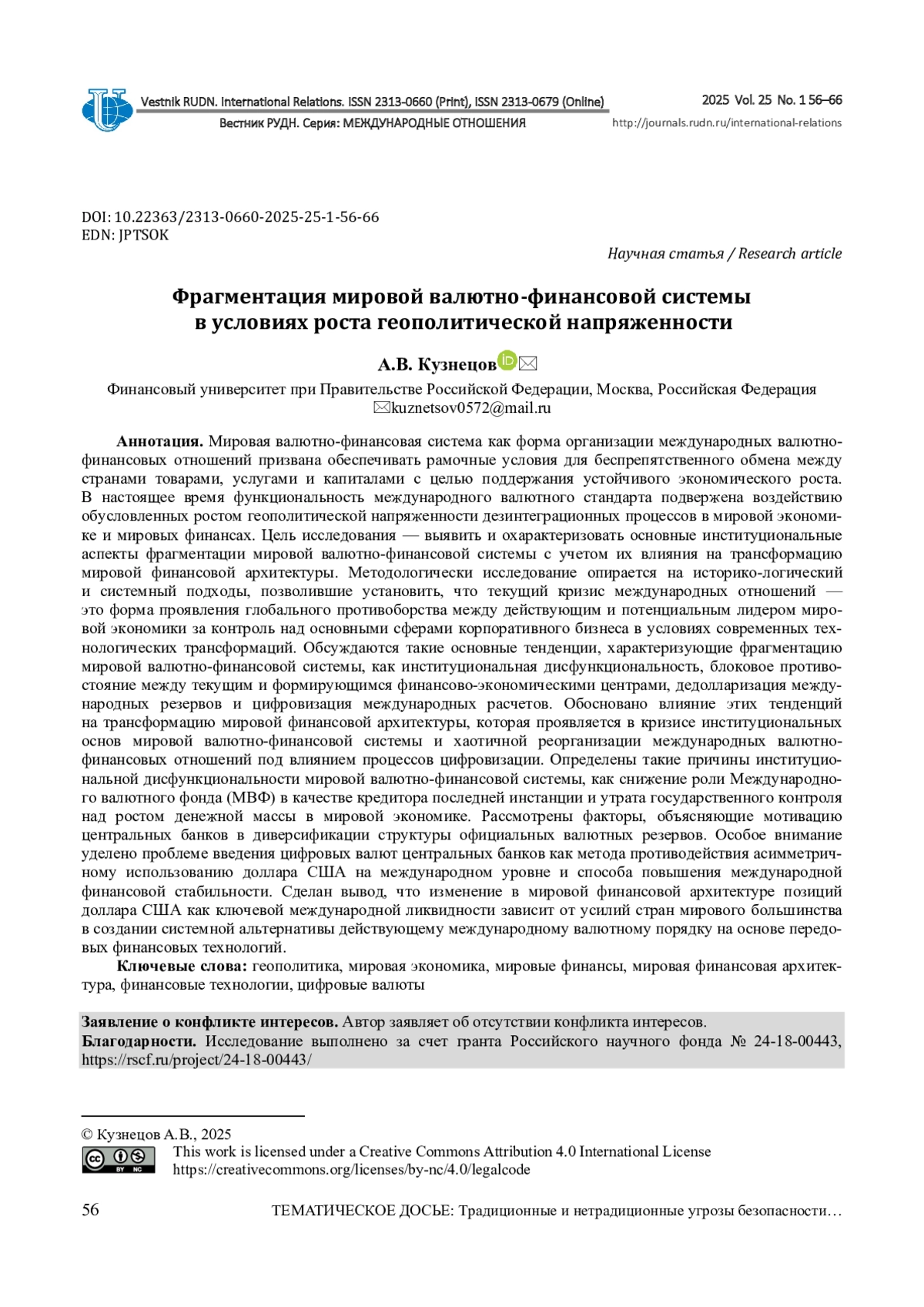 6. Кравченко Ю. Б. Фрагментационные процессы и позиции доллара США в мировой валютно-финансовой системе // Международная экономика. 2024. № 4. С. 249-258. ;. DOI: 10.33920/vne-04-2404-02 EDN: AZKVVM
