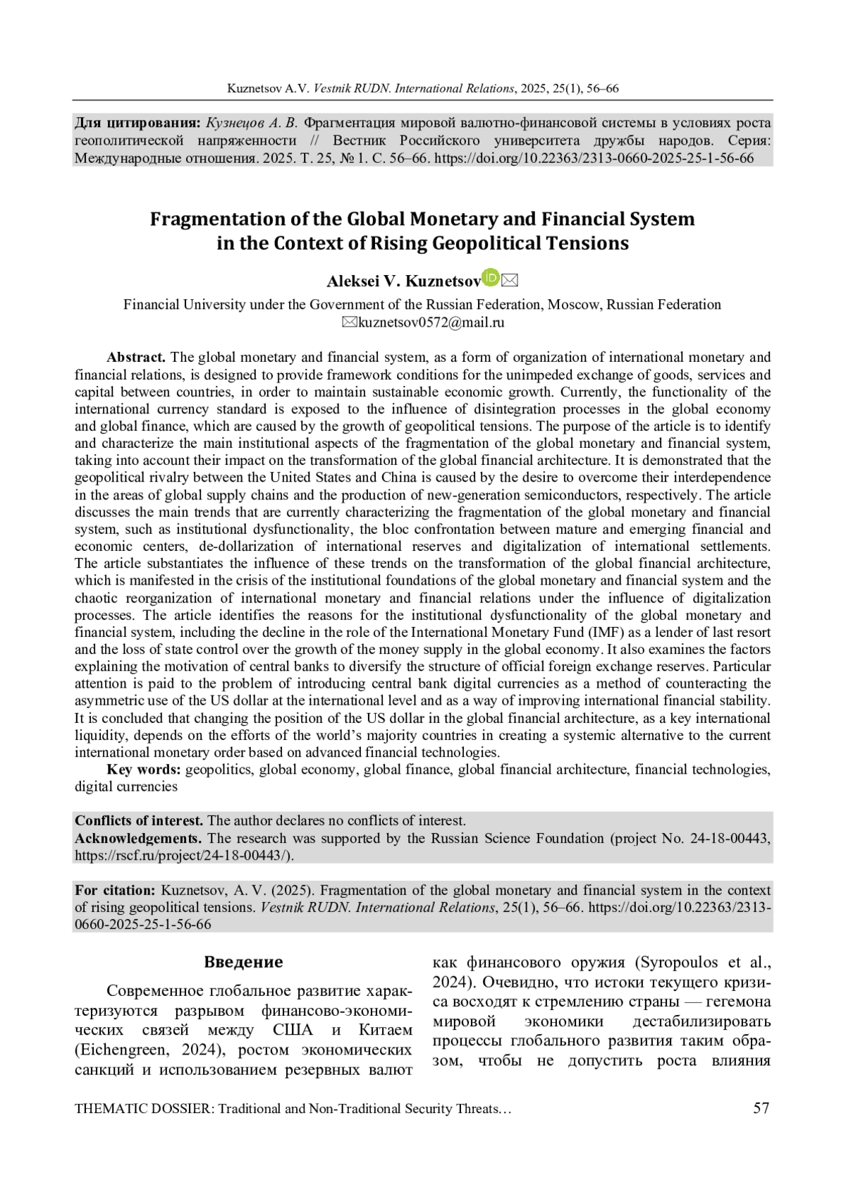 Мировая валютно-финансовая система как форма организации международных валютно-финансовых отношений призвана обеспечивать рамочные условия для беспрепятственного обмена между странами товарами, услугами и капиталами с целью поддержания устойчивого экономического роста. В настоящее время функциональность международного валютного стандарта подвержена воздействию обусловленных ростом геополитической напряженности дезинтеграционных процессов в мировой экономике и мировых финансах.