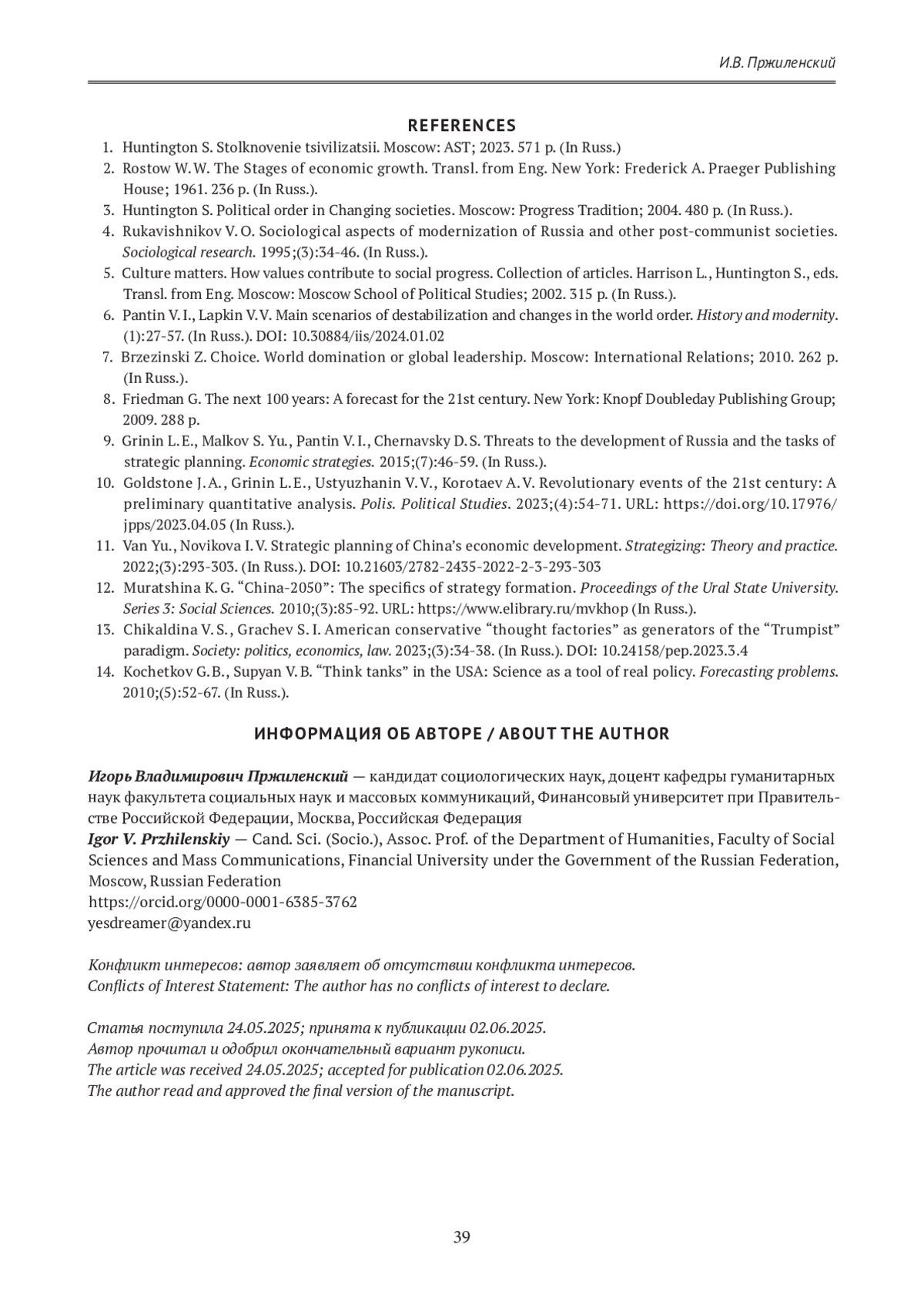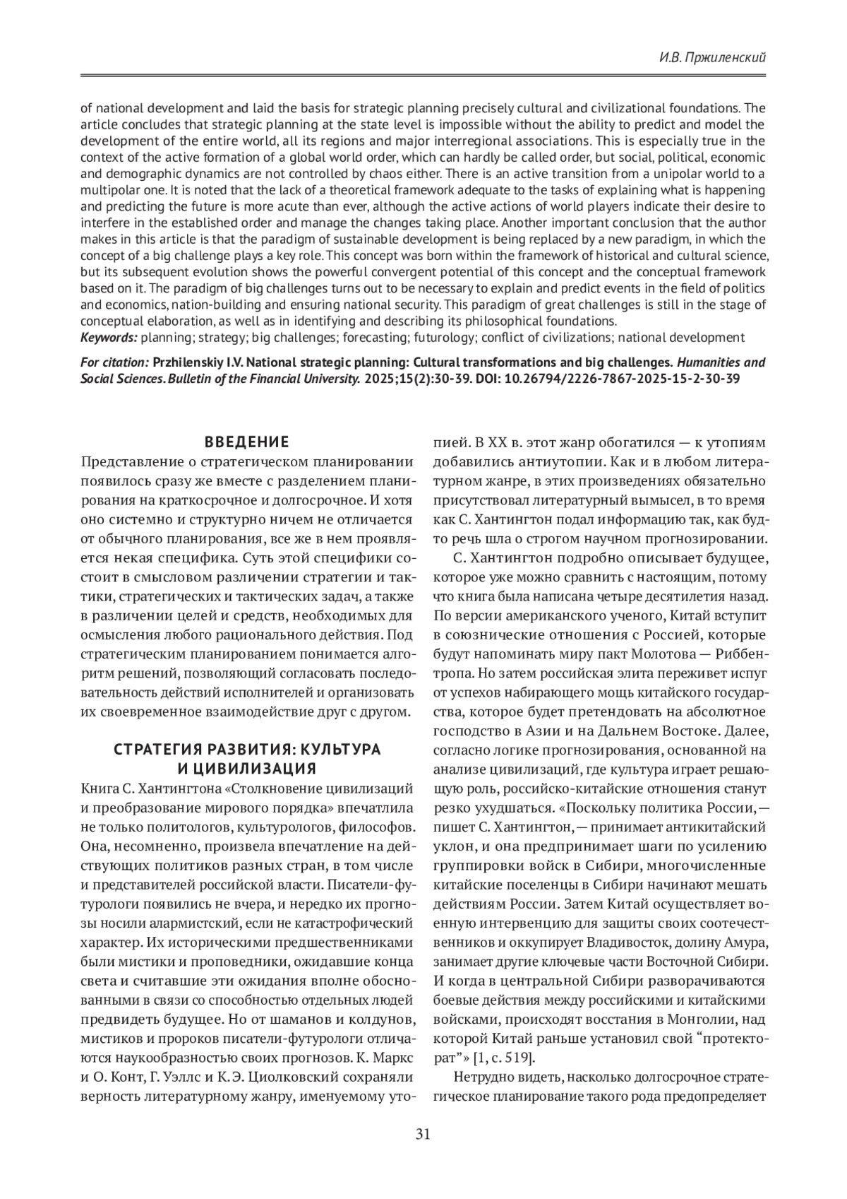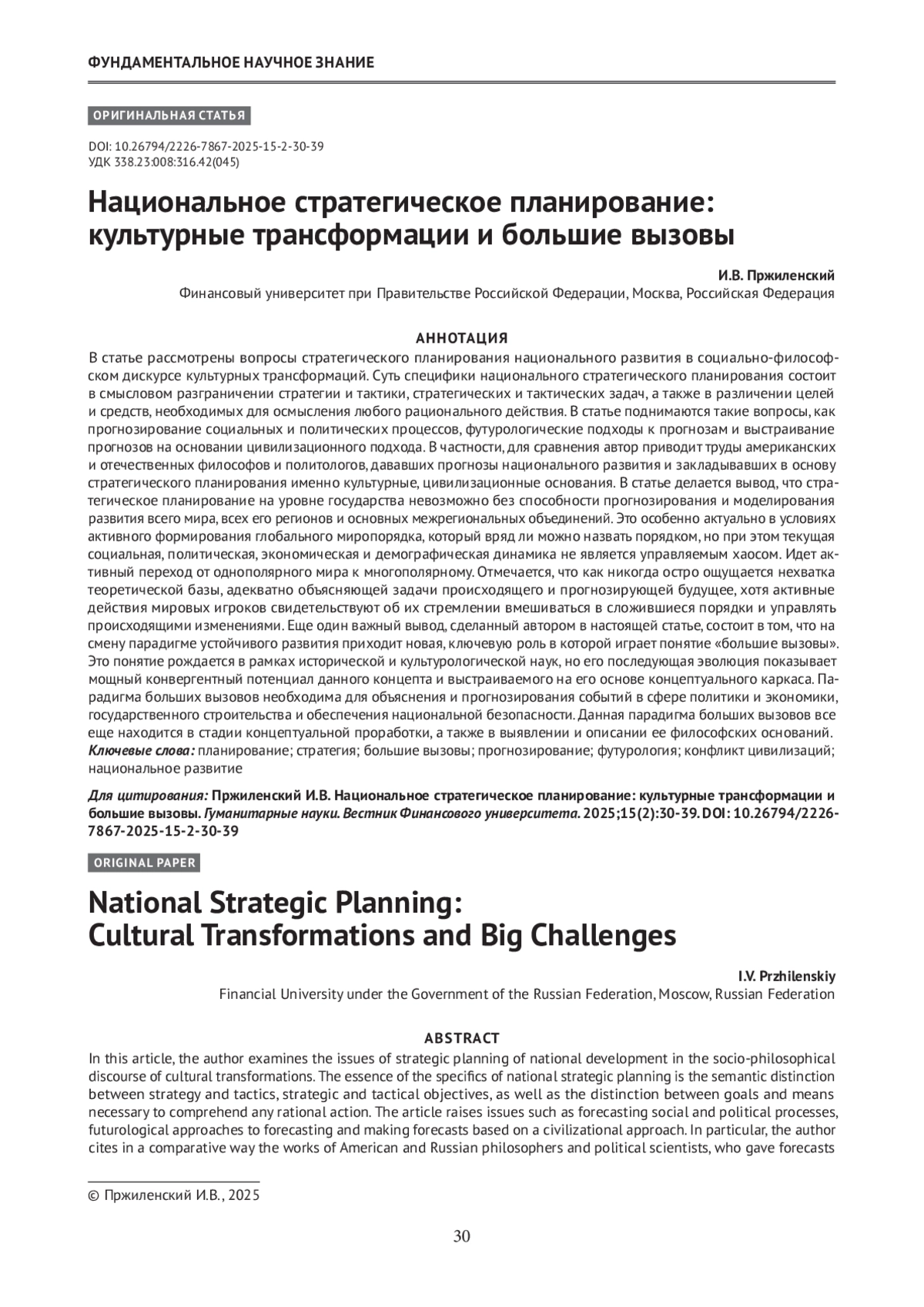 ПРЖИЛЕНСКИЙ И. В. НАЦИОНАЛЬНОЕ СТРАТЕГИЧЕСКОЕ ПЛАНИРОВАНИЕ: КУЛЬТУРНЫЕ ТРАНСФОРМАЦИИ И БОЛЬШИЕ ВЫЗОВЫ // ГУМАНИТАРНЫЕ НАУКИ. ВЕСТНИК ФИНАНСОВОГО УНИВЕРСИТЕТА. 2025. ТОМ 15, № 2