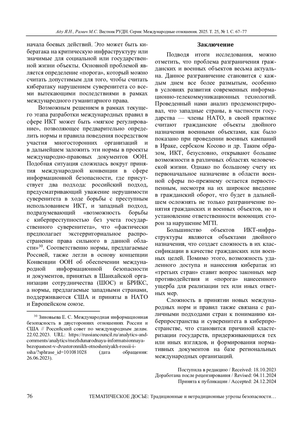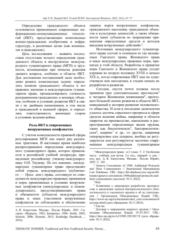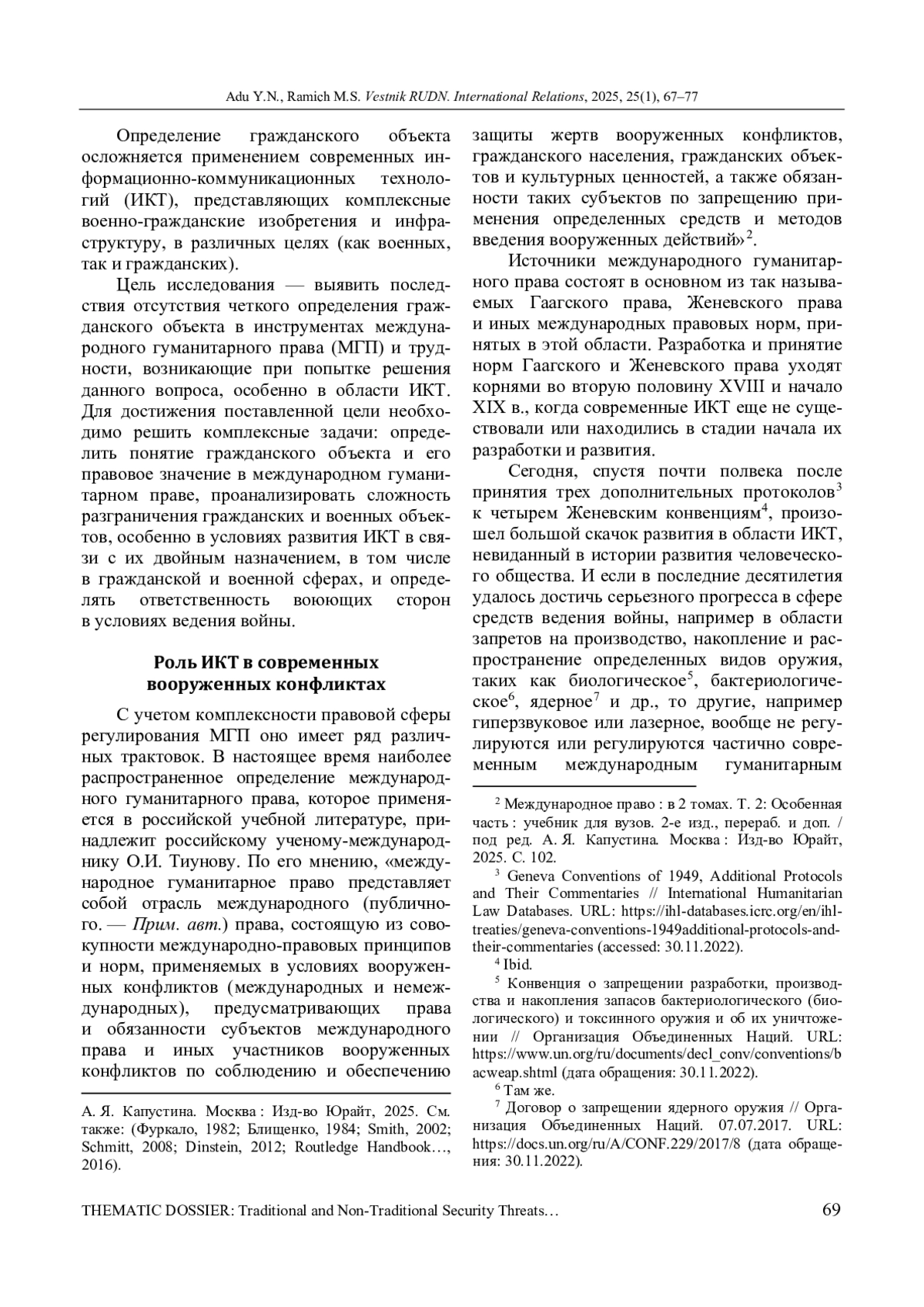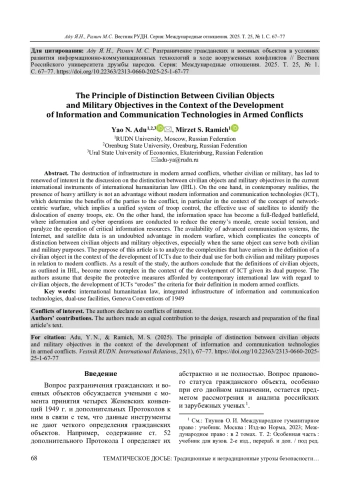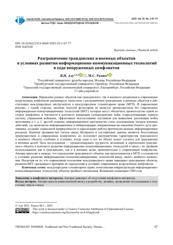 АДУ Я. Н., РАМИЧ М. С. РАЗГРАНИЧЕНИЕ ГРАЖДАНСКИХ И ВОЕННЫХ ОБЪЕКТОВ В УСЛОВИЯХ РАЗВИТИЯ ИНФОРМАЦИОННО-КОММУНИКАЦИОННЫХ ТЕХНОЛОГИЙ В ХОДЕ ВООРУЖЕННЫХ КОНФЛИКТОВ // ВЕСТНИК РОССИЙСКОГО УНИВЕРСИТЕТА ДРУЖБЫ НАРОДОВ. СЕРИЯ: МЕЖДУНАРОДНЫЕ ОТНОШЕНИЯ. 2025. ТОМ 25 № 1
