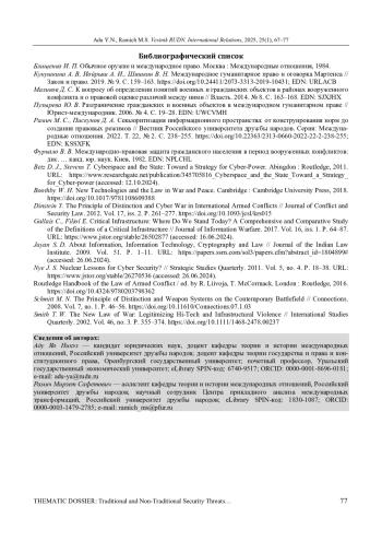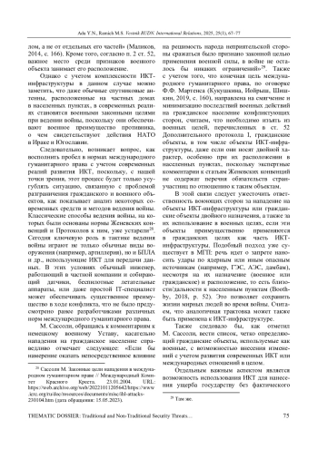 Ключевые фразы: МЕЖДУНАРОДНОЕ ГУМАНИТАРНОЕ ПРАВО, комплексная инфраструктура информационно-коммуникационных технологий, объекты двойного назначения, женевские конвенции 1949 года