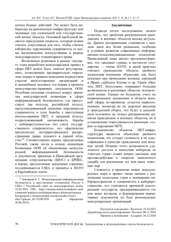 Цель исследования - проанализировать трудности, возникшие в определении гражданского объекта в контексте развития информационно-коммуникационных технологий в связи с их двойным использованием как в гражданских, так и в военных целях применительно к современным конфликтам. Авторы приходят к выводу, что определение гражданского объекта, как представляется в МГП, усложняется в условиях развития информационно-телекоммуникационных технологий ввиду своего двойного назначения. Несмотря на то, что современные положения международного права защищают гражданские объекты, развитие ИКТ «размывает» критерии их определения в условиях современных вооруженных конфликтов.