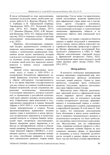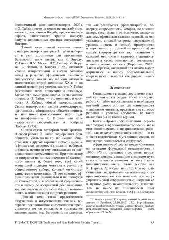 Анализируется научная дискуссия, развернувшаяся вокруг опубликованной в 2022 г. книги нигерийского философа и ученого Олуфеме Тайво «Против деколонизации: серьезный подход к африканской акторности», в которой был сформулирован новый подход к трактовке феномена деколонизации. Рассмотрено содержание публикации, выделены ее ключевые идейно-философские смыслы, а также исследована дискуссия вокруг работы О. Тайво в англо-американском научном сообществе. Последний раздел статьи посвящен критике монографии и выявлению ее «политической миссии», которая состоит в констатации необходимости противодействия тренду «деколонизации современности», набирающему силу во многих странах Африки южнее Сахары. Автор применяет интеллектуальный анализ текстовых данных (TDM) к монографии О. Тайво, а дискурс-анализ позволяет проанализировать характер дискуссии вокруг работы нигерийского философа. Делается вывод, что монография О. Тайво стала реакцией на серию революций и переворотов в Западной Африке, приведших к выходу таких стран, как Нигер, Буркина-Фасо, Мали и др., из-под французского неоколониального влияния. Возникший тренд на освобождение африканских стран от неоколониальной зависимости и неспособность бывших метрополий остановить данный процесс потребовали от западного научного сообщества срочной разработки идейной платформы, утверждающей необходимость сохранения прежнего неоколониального порядка. О. Тайво в своей монографии представляет такой идеологический концепт. Его суть сводится к тезису о том, что, когда африканские колонии обрели государственность, они стали независимы и деколонизация была завершена. Дальнейшая деколонизация, именуемая в книге «деколонизация современности», вредна и разрушает комплексное историко-культурное наследие, необходимое африканцам для развития. Как следствие, риторика «деколонизации современности» нелегитимна и должна быть прекращена.