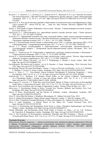 3. Бокерия С. А., Давидчук А. С., Дегтерев Д. А., Дубровский И. Р., Журавлева Е. В. и др. Советские исследования неоколониализма // Вестник Российского университета дружбы народов. Серия: Международные отношения. 2022. Т. 22, № 4. С. 671-687. ;. DOI: 10.22363/2313-0660-2022-22-4-671-687 EDN: GYGFFS