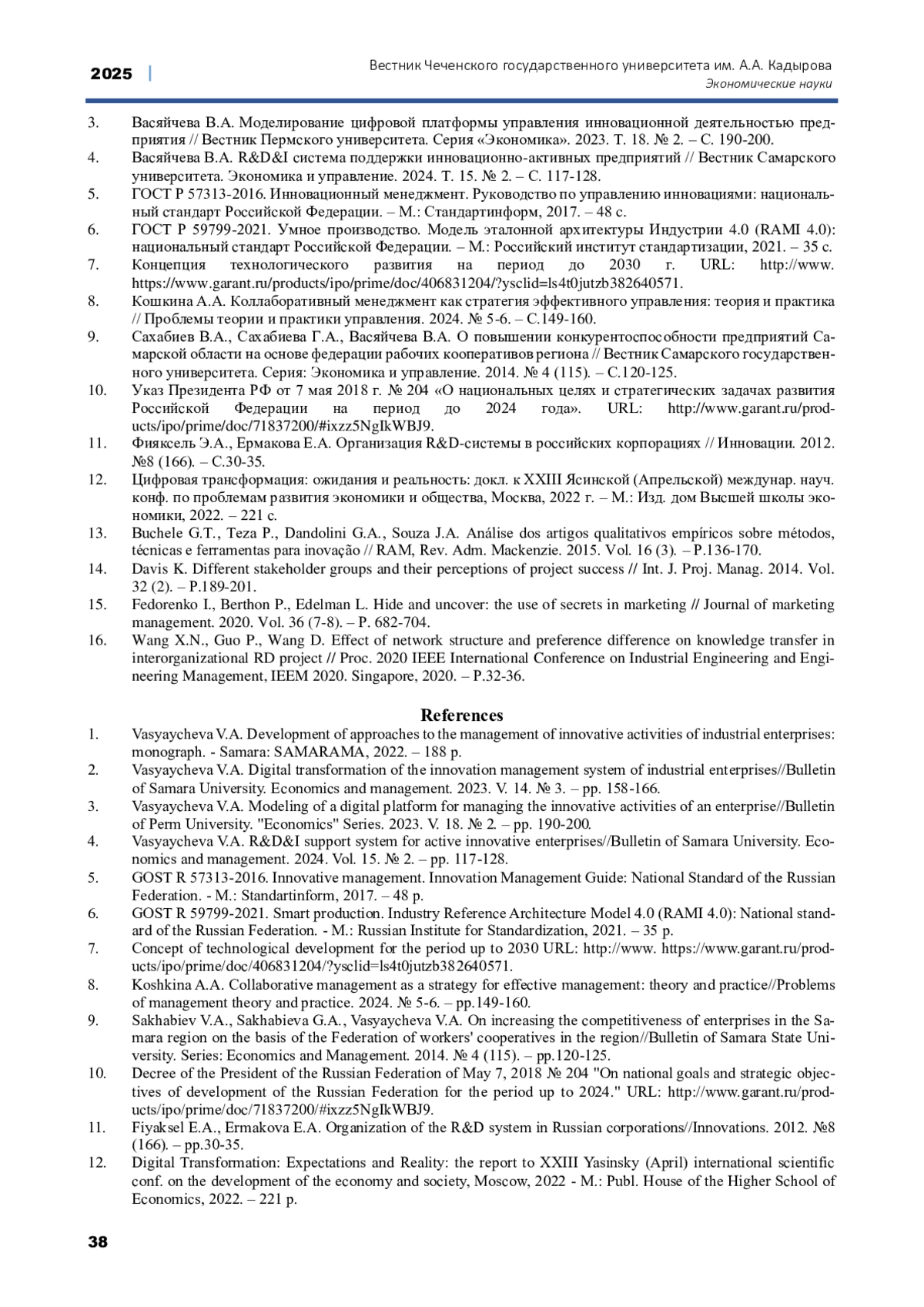 2. Васяйчева В.А. Цифровая трансформация системы управления инновационной деятельностью промышленных предприятий // Вестник Самарского университета. Экономика и управление. 2023. Т. 14. № 3. - С. 158-166. EDN: HREPQI