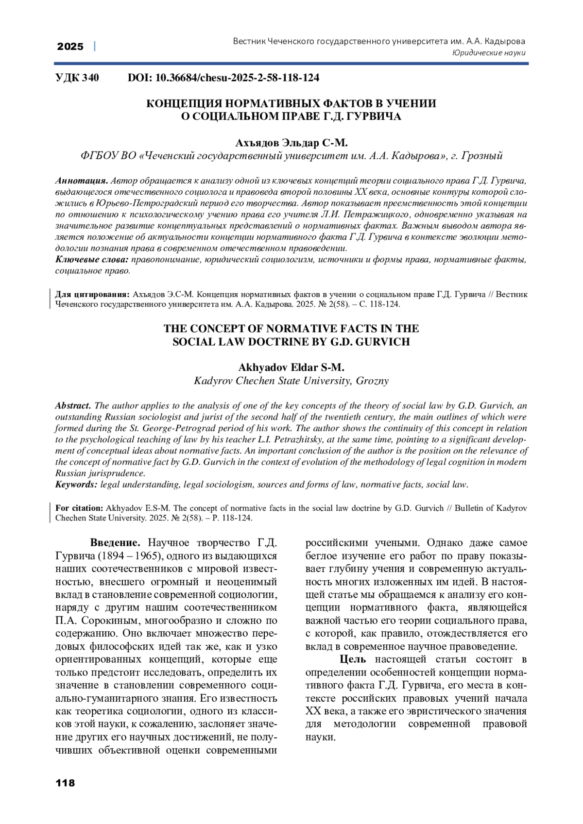 Автор обращается к анализу одной из ключевых концепций теории социального права Г. Д. Гурвича, выдающегося отечественного социолога и правоведа второй половины ХХ века, основные контуры которой сложились в Юрьево-Петроградский период его творчества. Автор показывает преемственность этой концепции по отношению к психологическому учению права его учителя Л. И. Петражицкого, одновременно указывая на значительное развитие концептуальных представлений о нормативных фактах. Важным выводом автора является положение об актуальности концепции нормативного факта Г. Д. Гурвича в контексте эволюции методологии познания права в современном отечественном правоведении.
