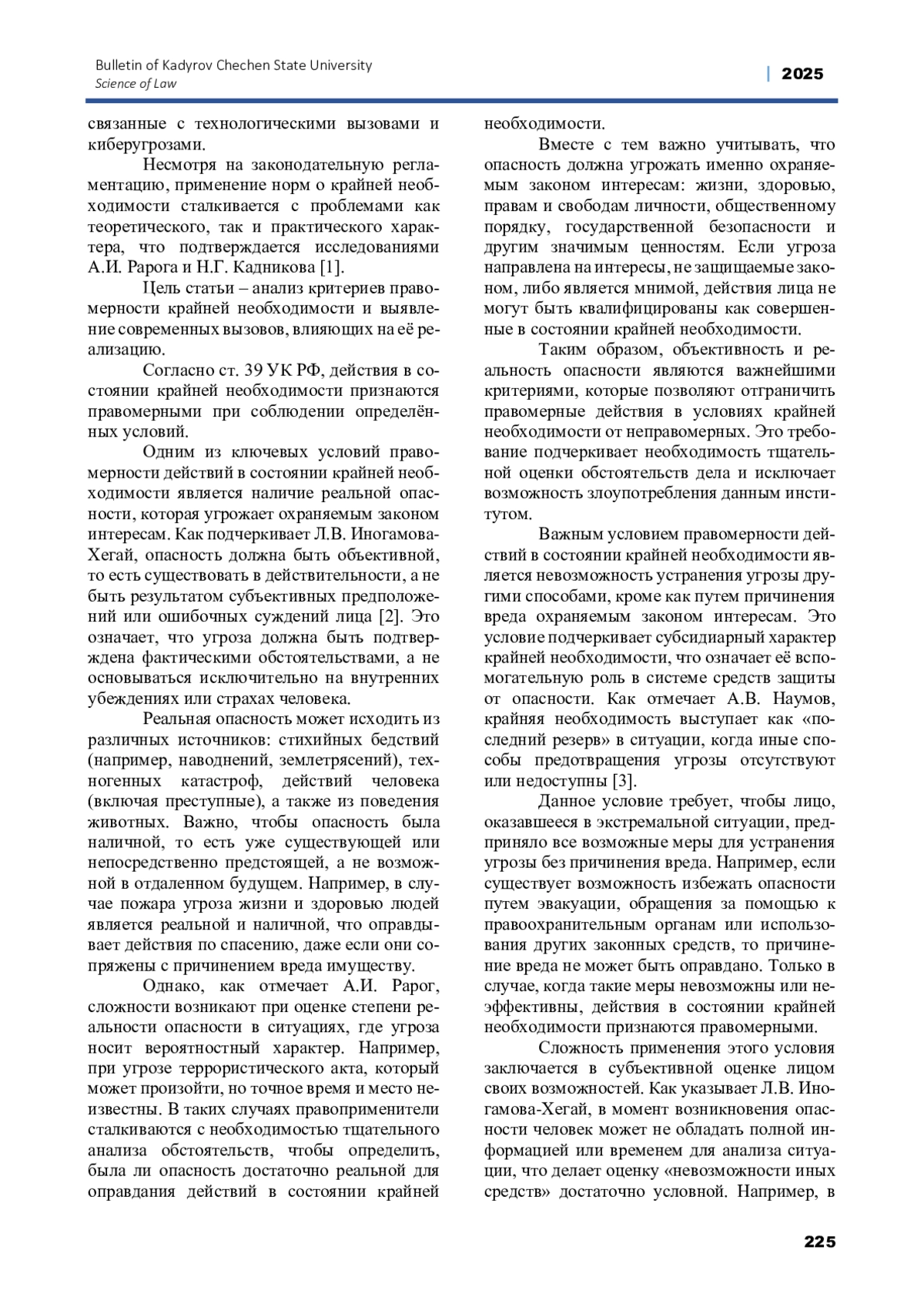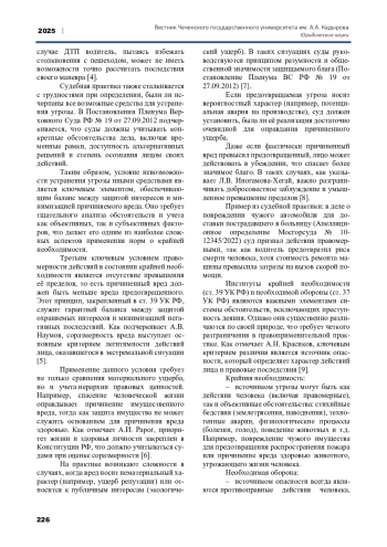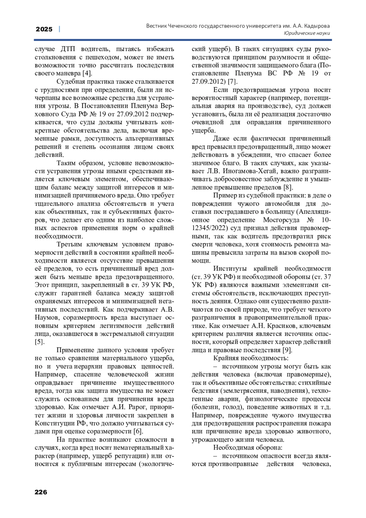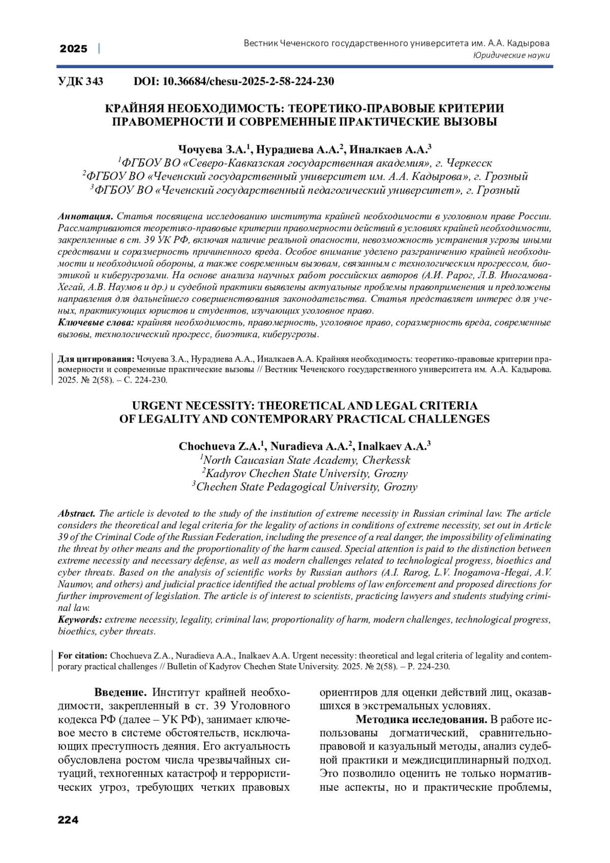 ЧОЧУЕВА З.А., НУРАДИЕВА А.А., ИНАЛКАЕВ А.А. КРАЙНЯЯ НЕОБХОДИМОСТЬ: ТЕОРЕТИКО-ПРАВОВЫЕ КРИТЕРИИ ПРАВОМЕРНОСТИ И СОВРЕМЕННЫЕ ПРАКТИЧЕСКИЕ ВЫЗОВЫ // ВЕСТНИК ЧЕЧЕНСКОГО ГОСУДАРСТВЕННОГО УНИВЕРСИТЕТА ИМ. А. А. КАДЫРОВА. 2025. № 2 (58)