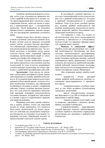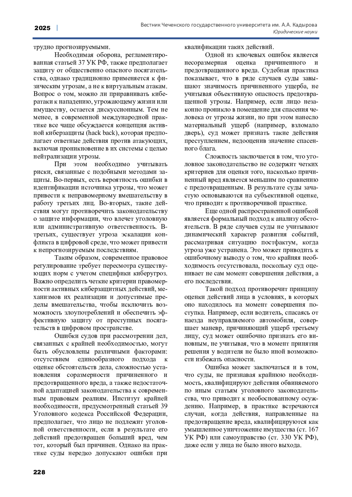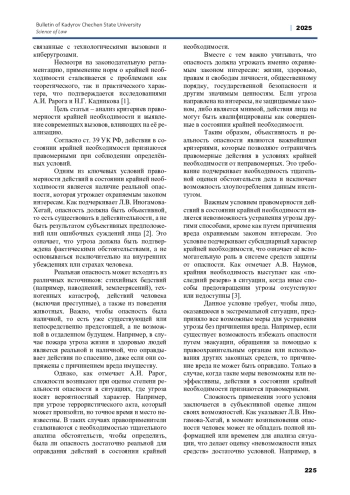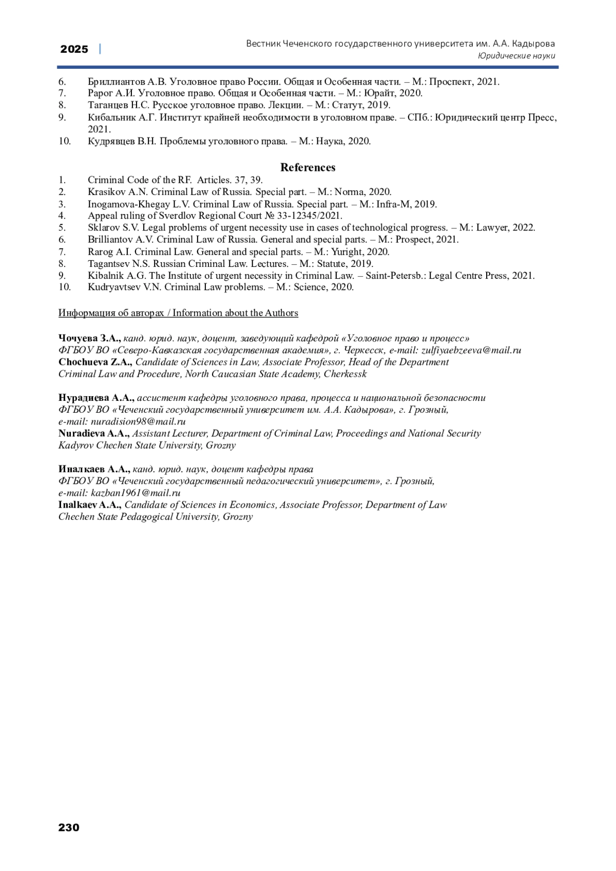 ЧОЧУЕВА З.А., НУРАДИЕВА А.А., ИНАЛКАЕВ А.А. КРАЙНЯЯ НЕОБХОДИМОСТЬ: ТЕОРЕТИКО-ПРАВОВЫЕ КРИТЕРИИ ПРАВОМЕРНОСТИ И СОВРЕМЕННЫЕ ПРАКТИЧЕСКИЕ ВЫЗОВЫ // ВЕСТНИК ЧЕЧЕНСКОГО ГОСУДАРСТВЕННОГО УНИВЕРСИТЕТА ИМ. А. А. КАДЫРОВА. 2025. № 2 (58)