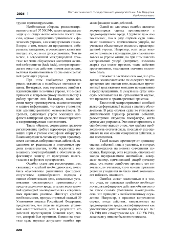 Ключевые фразы: крайняя необходимость, правомерность, уголовное право, соразмерность вреда, СОВРЕМЕННЫЕ ВЫЗОВЫ, ТЕХНОЛОГИЧЕСКИЙ ПРОГРЕСС, биоэтика, киберугрозы