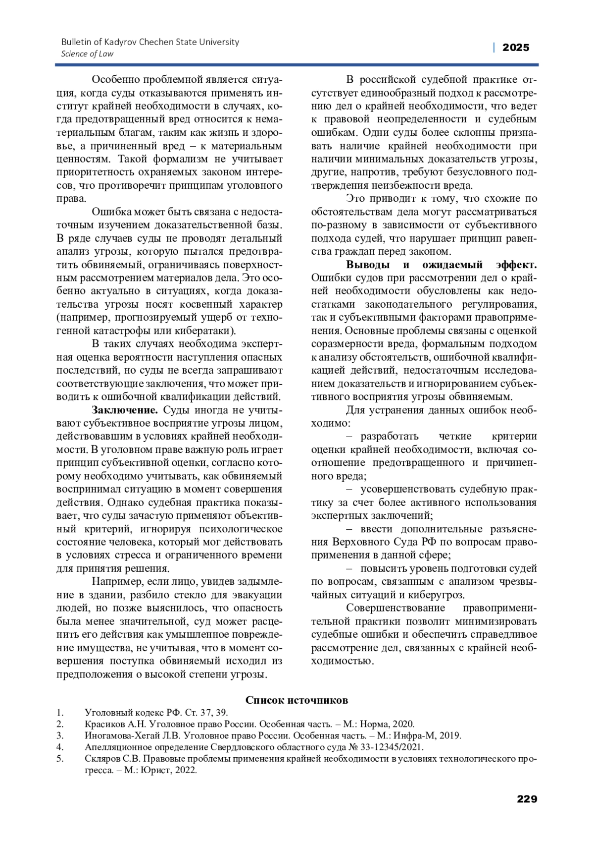 Статья: КРАЙНЯЯ НЕОБХОДИМОСТЬ: ТЕОРЕТИКО-ПРАВОВЫЕ КРИТЕРИИ ПРАВОМЕРНОСТИ И СОВРЕМЕННЫЕ ПРАКТИЧЕСКИЕ ВЫЗОВЫ (2025)
