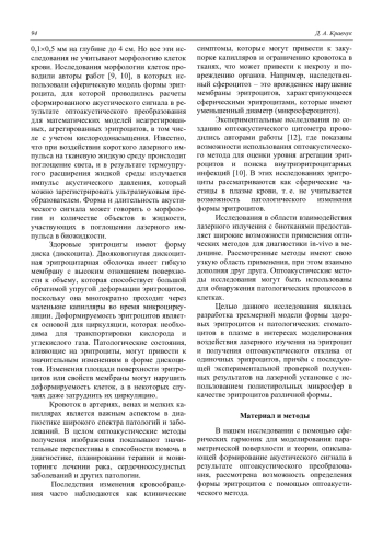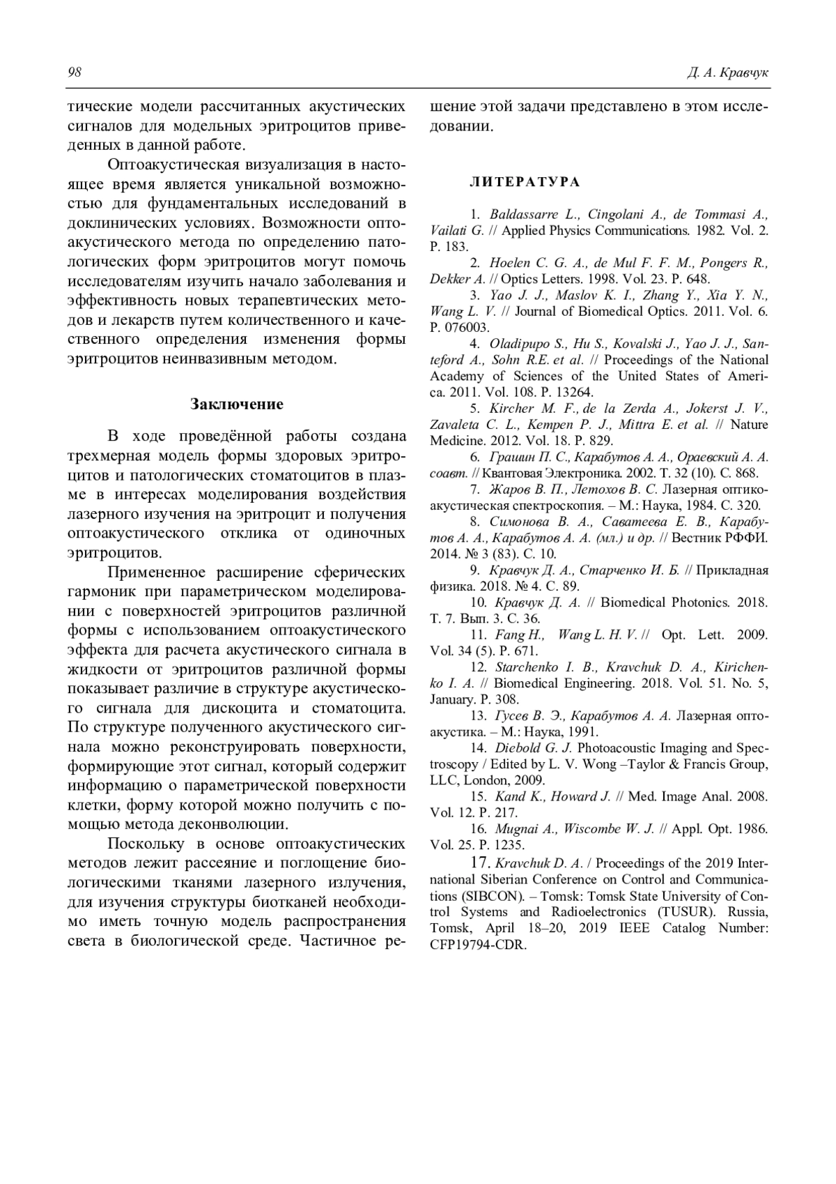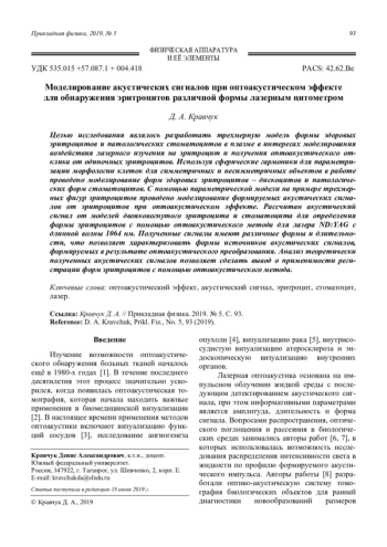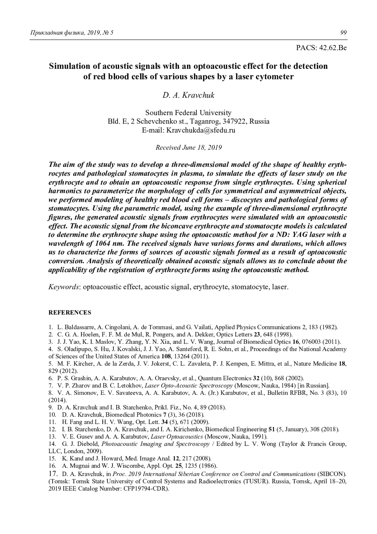КРАВЧУК Д. А. МОДЕЛИРОВАНИЕ АКУСТИЧЕСКИХ СИГНАЛОВ ПРИ ОПТОАКУСТИЧЕСКОМ ЭФФЕКТЕ ДЛЯ ОБНАРУЖЕНИЯ ЭРИТРОЦИТОВ РАЗЛИЧНОЙ ФОРМЫ ЛАЗЕРНЫМ ЦИТОМЕТРОМ // ПРИКЛАДНАЯ ФИЗИКА. 2019. №5