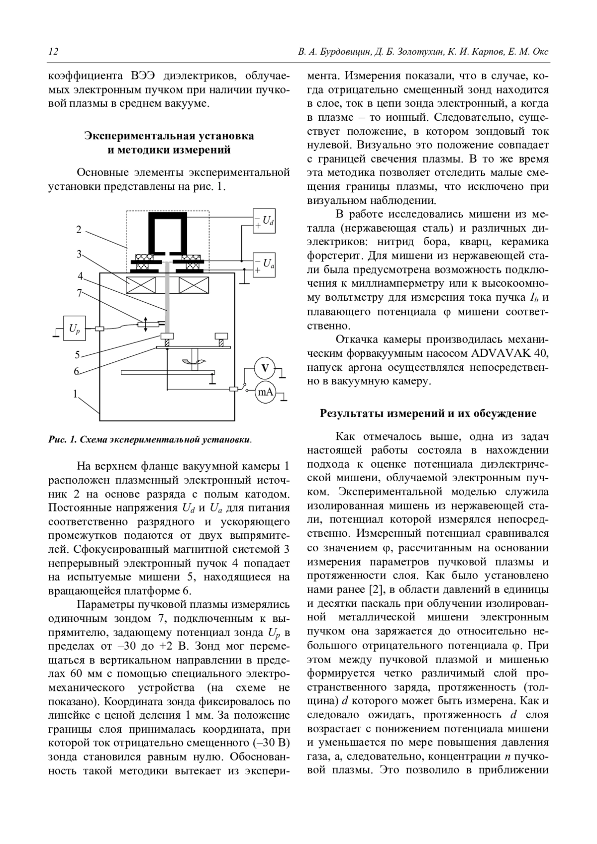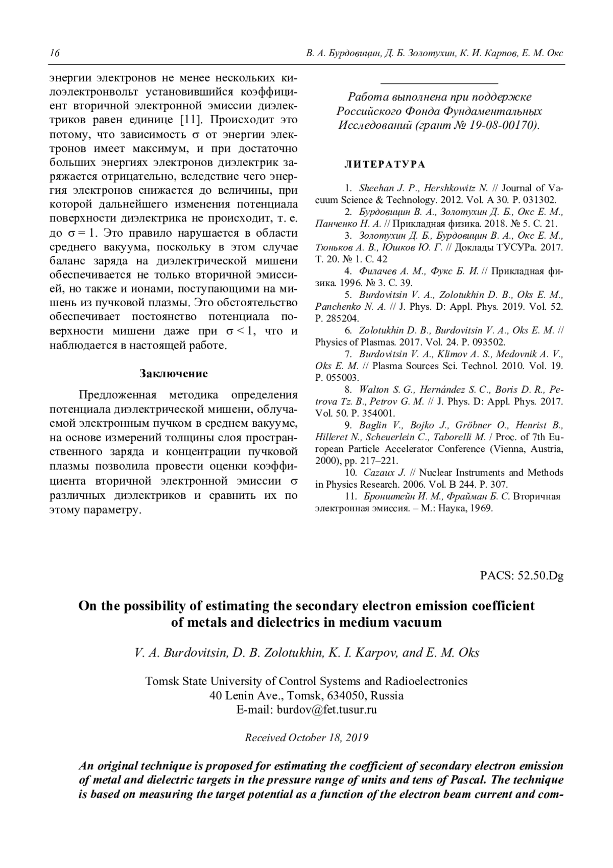 Бурдовицин В. А., Золотухин Д. Б., Карпов К. И., Окс Е. М. О возможности оценки коэффициента вторично-электронной эмиссии металлов и ди-электриков в среднем вакууме 11