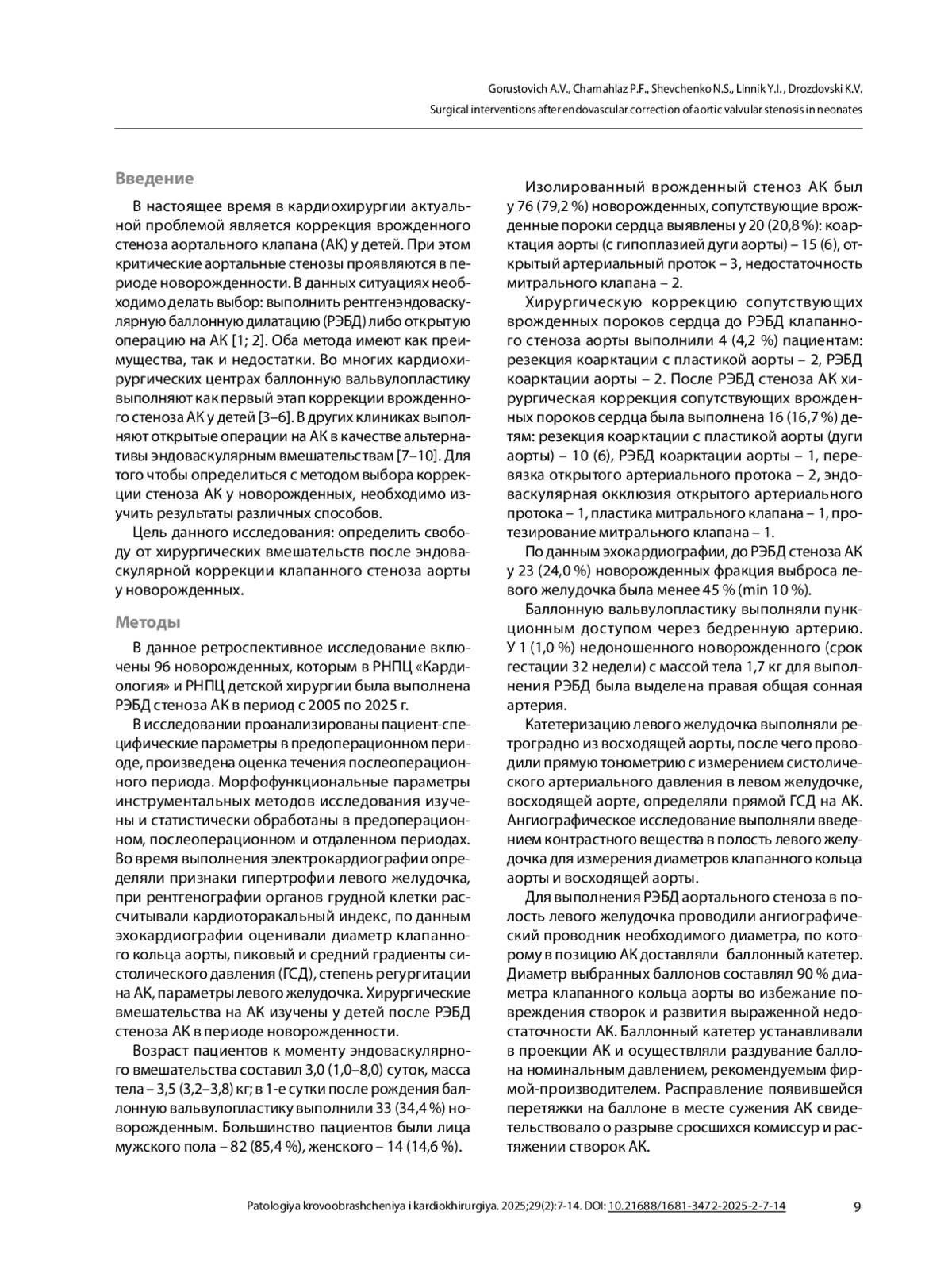 В настоящее время в кардиохирургии актуальной проблемой является коррекция врожденного стеноза аортального клапана (АК) у детей. При этом критические аортальные стенозы проявляются в периоде новорожденности. В данных ситуациях необходимо делать выбор: выполнить рентгенэндоваскулярную баллонную дилатацию (РЭБД) либо открытую операцию на АК [1; 2]. Оба метода имеют как преимущества, так и недостатки. Во многих кардиохирургических центрах баллонную вальвулопластику выполняют как первый этап коррекции врожденного стеноза АК у детей [3–6]. В других клиниках выполняют открытые операции на АК в качестве альтернативы эндоваскулярным вмешательствам [7–10]. Для того чтобы определиться с методом выбора коррекции стеноза АК у новорожденных, необходимо изучить результаты различных способов.