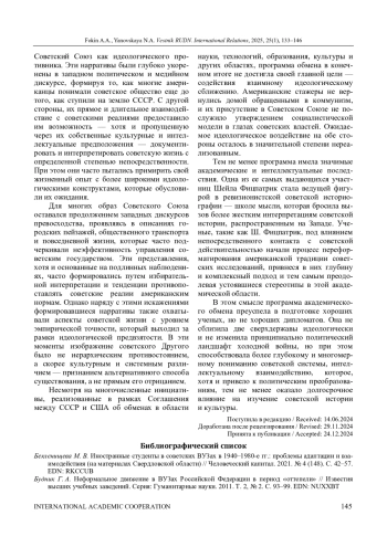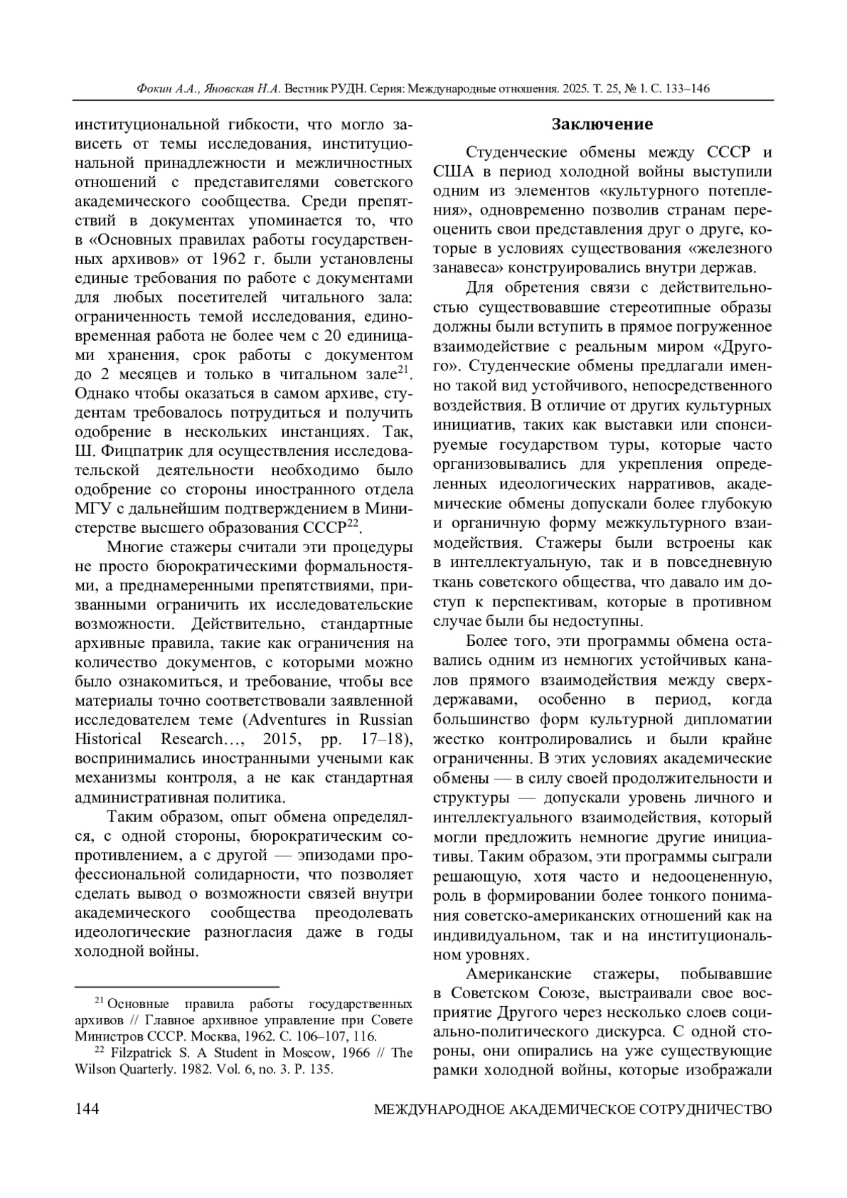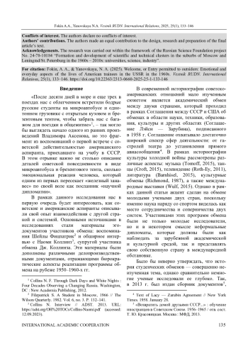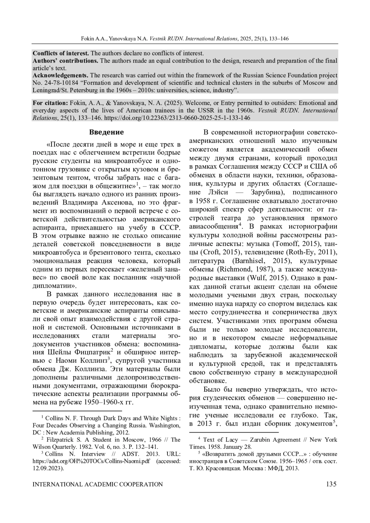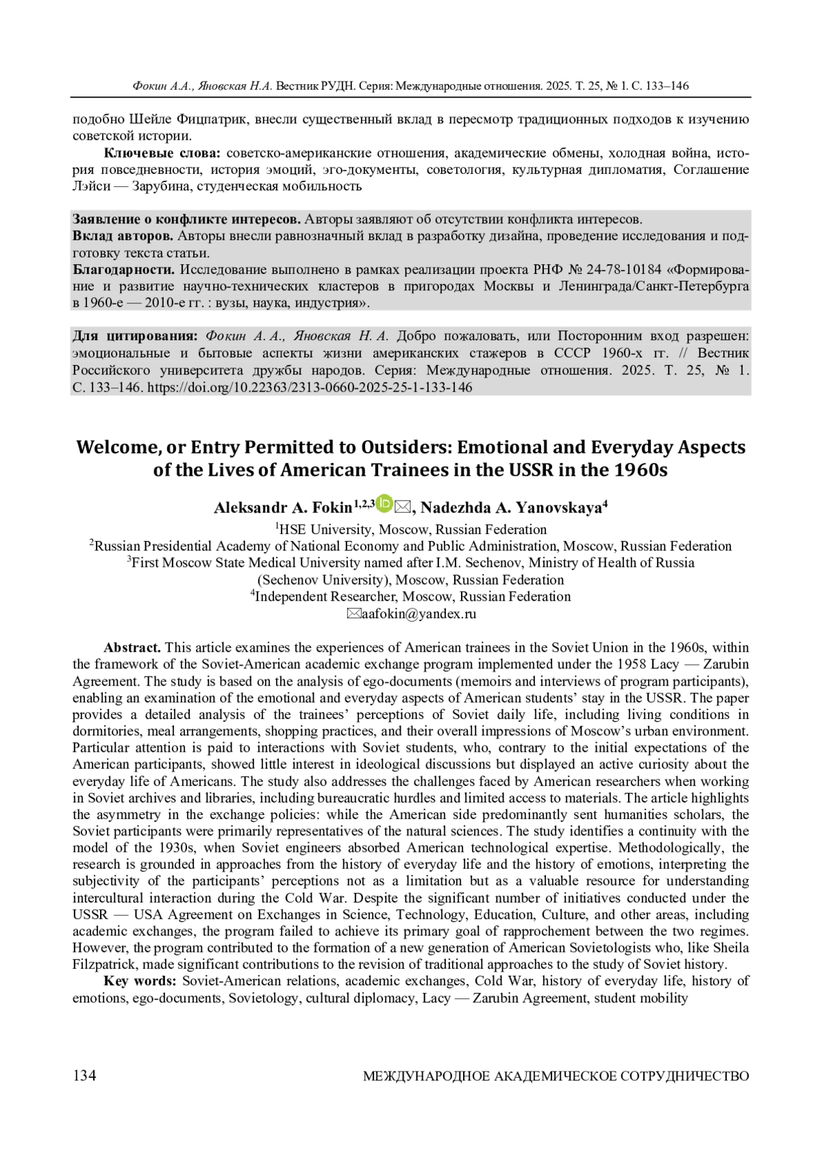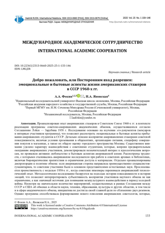 ФОКИН А. А., ЯНОВСКАЯ Н. А. ДОБРО ПОЖАЛОВАТЬ, ИЛИ ПОСТОРОННИМ ВХОД РАЗРЕШЕН: ЭМОЦИОНАЛЬНЫЕ И БЫТОВЫЕ АСПЕКТЫ ЖИЗНИ АМЕРИКАНСКИХ СТАЖЕРОВ В СССР 1960-Х ГГ. // ВЕСТНИК РОССИЙСКОГО УНИВЕРСИТЕТА ДРУЖБЫ НАРОДОВ. СЕРИЯ: МЕЖДУНАРОДНЫЕ ОТНОШЕНИЯ. 2025. ТОМ 25 № 1