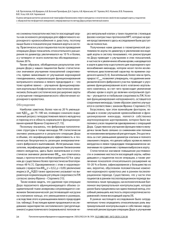 Результаты. До операции конечно-диастолический объем левого желудочка (ЛЖ) составлял у всех пациентов > 200 мл за счет того, что 30–40% поверхности левого желудочка составляла трансмурально поврежденная мышечная ткань, т. е. собственно аневризма, которая затем удалялась субтотально в ходе операции Дора. В результате у левого желудочка происходило значительное, более чем на 20% уменьшение конечно-диастолического объема, до величин 175–180 мл. Уменьшалась и масса миокарда левого желудочка с 284 ± 17,9 до 260 ± 17,6 г благодаря резекции большей части аневризмы в ходе операции Дора. При исследовании с контрастным усилением оказалось, что доля повреждения миокарда, т. е. участки фиброза миокарда левого желудочка, статистически значимо уменьшаются в объеме, с 42 ± 7 до 33,8 ± 10 %. Интегральным показателем, верифицирующим улучшение биомеханики левого желудочка, здесь было значительное и статистически значимое увеличение фракции выброса левого желудочка, с прогностически неблагоприятных 42 % в среднем по группе до 48 %, которые ассоциируются с существенно лучшим прогнозом. Коррелировавшее с приростом фракции выброса ЛЖ (r = 0,52, p < 0,05) увеличение индекса отношения работы ЛЖ за удар к конечно-диастолическому объему (Ауд/КДО) также однозначно указывает на выраженную нормализацию регуляции сократимости миокарда левого желудочка по Франку‑Старлингу. Диаметр кольца митрального клапана в результате операции Дора статистически значимо уменьшался (имплантация специализированных протезирующих митральных колец при этом не проводилась) с 31 ± 3,2 до 25 ± 2,8 мм (p < 0,05), а вследствие этого улучшались (снижались) и величины объема левого предсердия с 83,6 ± 23,9 до 68,1 ± 15,1 мл (p < 0,05). Также улучшалась систолическая растяжимость аорты при оценке ее как увеличения объема восходящей аорты в систолу – с 14,9 ± 5,56 до 21,1 ± 4,1 мл (p < 0,05).